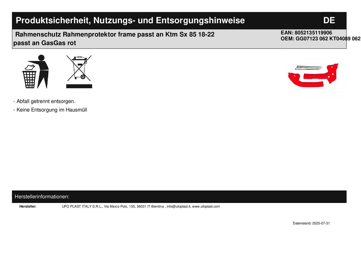 Rahmenschutz Rahmenprotektor frame passt an Ktm Sx 85 18-22 passt an GasGas rot