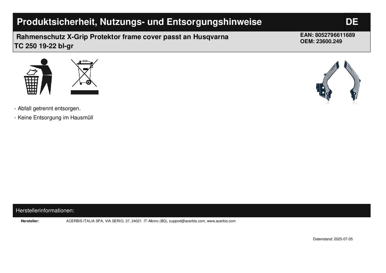 Acerbis Rahmenschutz X-Grip Protektor frame cover passt an Husqvarna TC 250 19-22 bl-gr