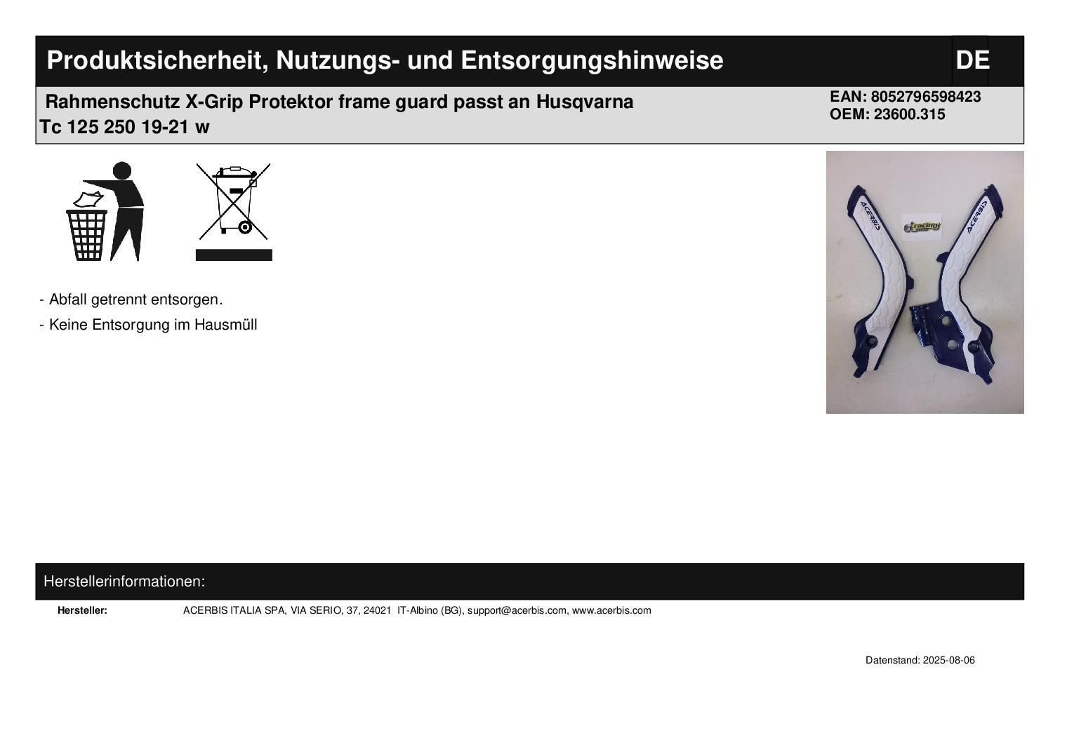 Acerbis Rahmenschutz X-Grip Protektor frame guard passt an Husqvarna Tc 125 250 19-21 w