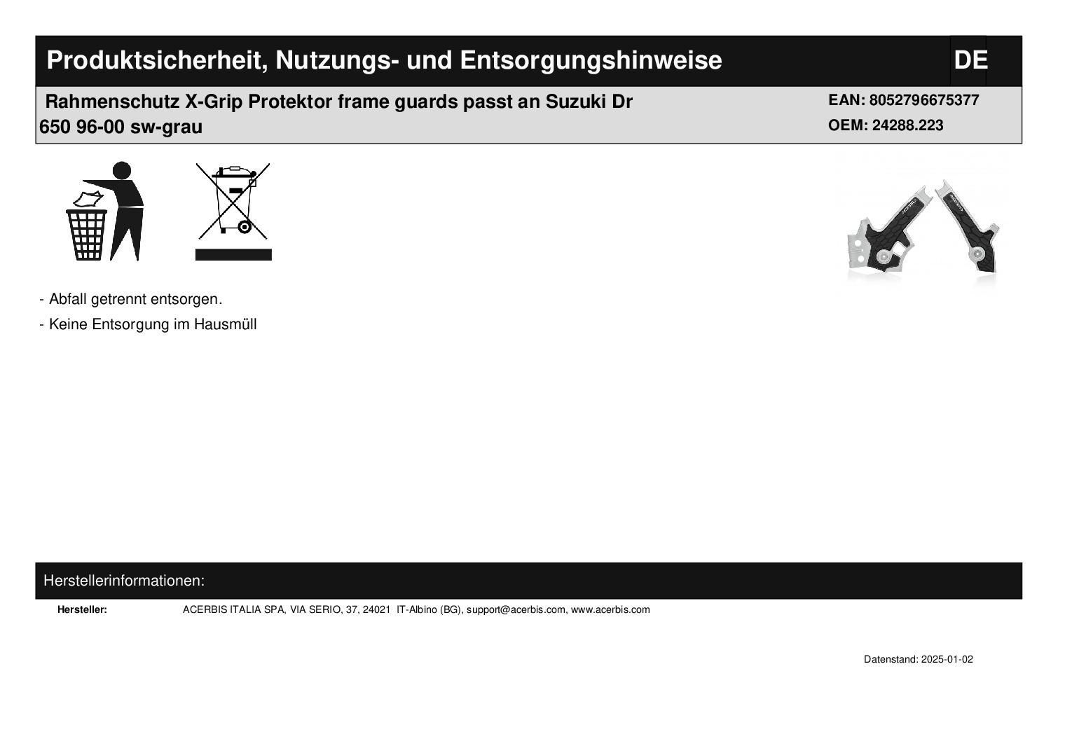 Acerbis Rahmenschutz X-Grip Protektor frame guards passt an Suzuki Dr 650 96-00 sw-grau