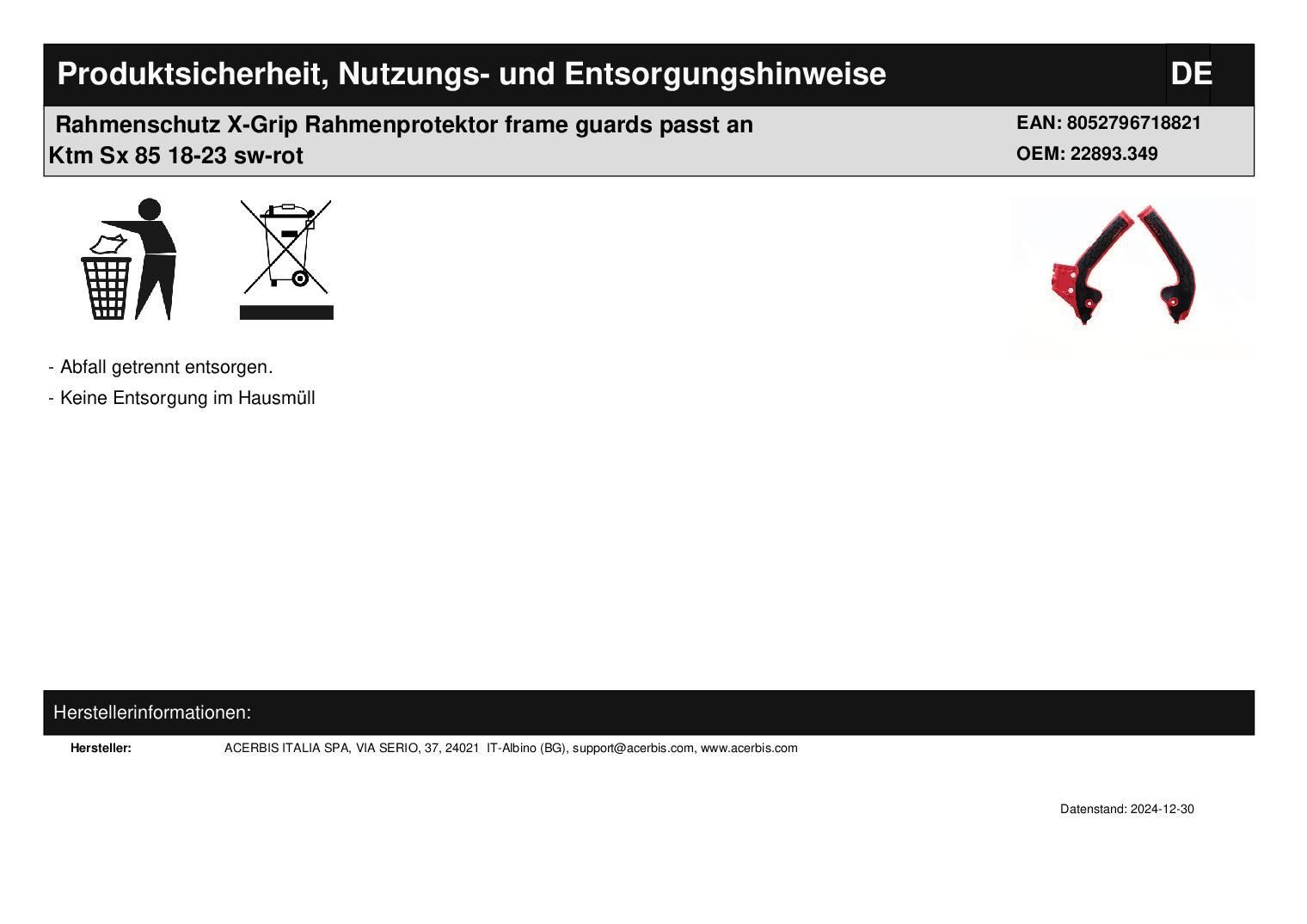 Acerbis Rahmenschutz X-Grip Rahmenprotektor frame guards passt an Ktm Sx 85 18-23 sw-rot