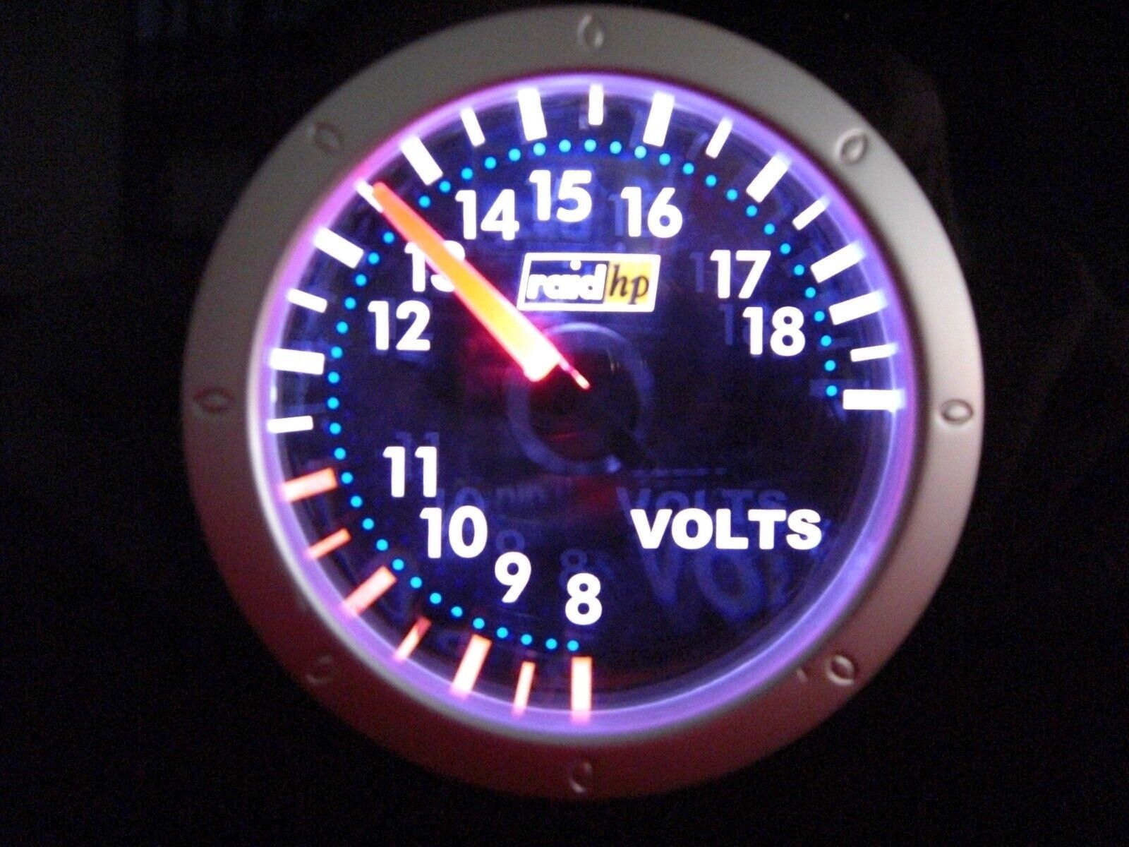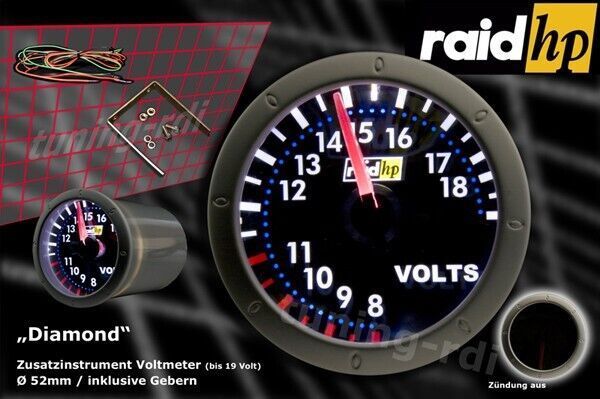 Artikelbezeichnung Raid hp Nightflight Diamond 12 Voltanzeige LED beleuchtetes Display (mit superwhite - LED) 12 Voltanzeige weiß-blaue Ziffern Bereich von der Anzeige geht von 8-18 Volt • Einbautiefe: ca. 70 mm Einbaudurchmesser: 52 mm • Ziffernblatt: schwarz • Nadel rot ( LED beleuchtet) • Ab 8-11