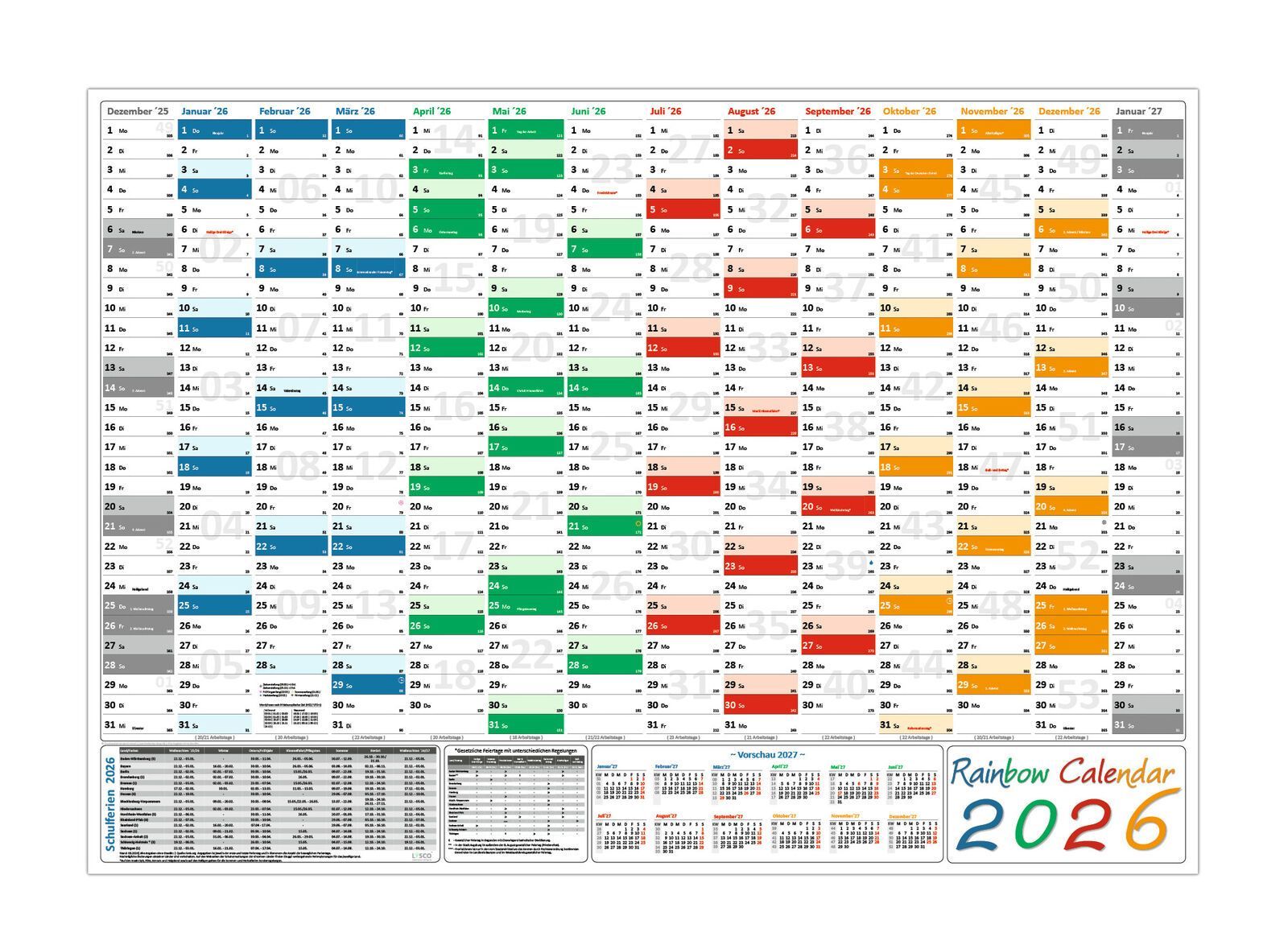 Rainbow Wandkalender DIN A2 2026 gerollt Wandplaner Ferien & Feiertage