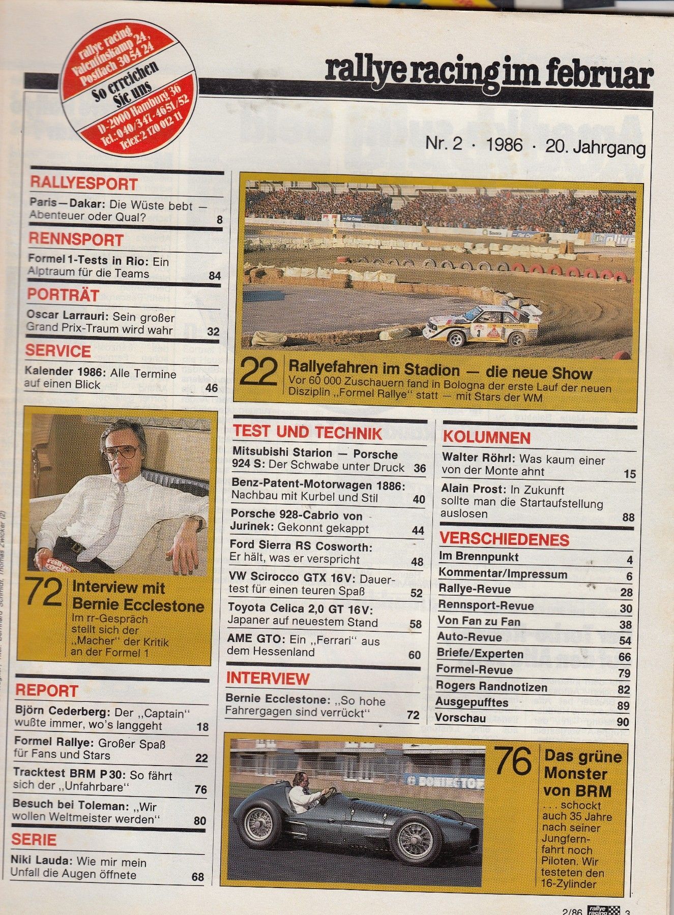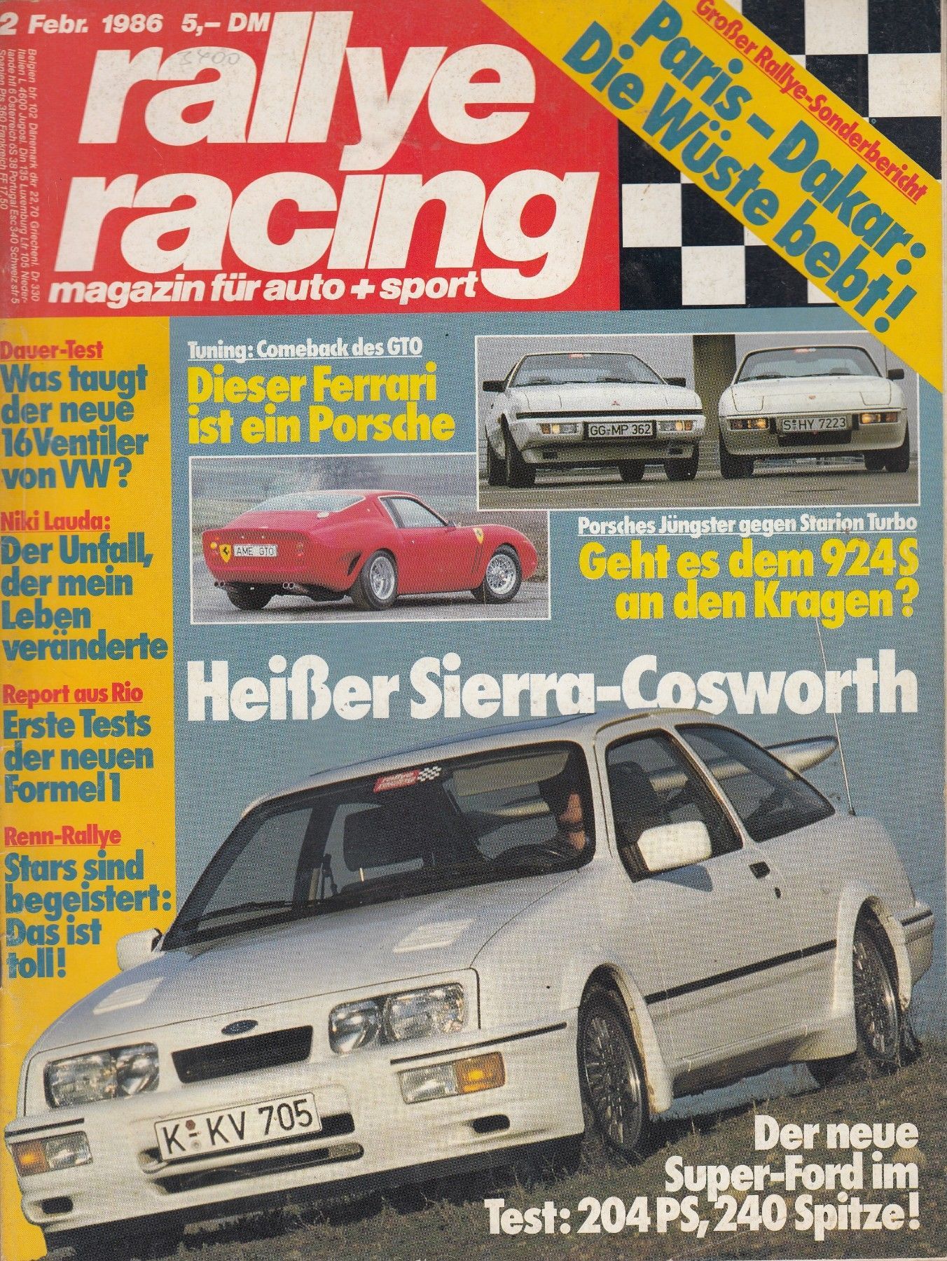 rallye racing Heft 2 1986 Test und Technik: Mitsubishi Starion und Porsche 924 S, Porsche 928 Cabrio, Ford Sierra Cosworth, VW Scirocco GTX 16V, Toyota Celica 2,0 GT 16 V, AME GTO Formel 1 Test in Rio, Interview Bernie Ecclestone, Porträt Oscar Larrauri Rallye Paris - Dakar Kolummen: Walter Röhrl un... Mehr