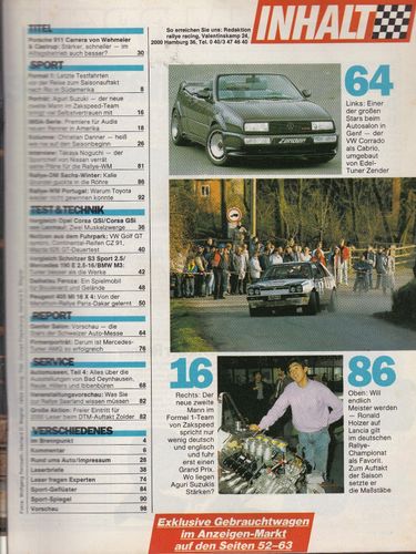 rallye racing Heft 6 - 15.03.1989 Porsche 911 Carrera von Wehmeier & Castrup Vergleich Opel Corsa GSi Lexmaul GSi Vergleich: Schnitzer S3 Sport 2.5 gegen Mercedes 190 E 2.5- 16 und BMW M3 VW Corrado Cabrio von Zender Formel 1 Aguri Suzuki bei Zakspeed Kolumme Christian Danner Rallye: Sachs Winte... Mehr