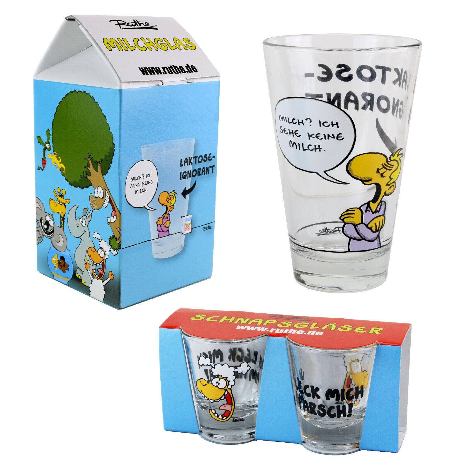 Ralph Ruthe Geschenkset Milchglas Laktose-Ignorant + 2 Schnapsgläser "Leck mich"