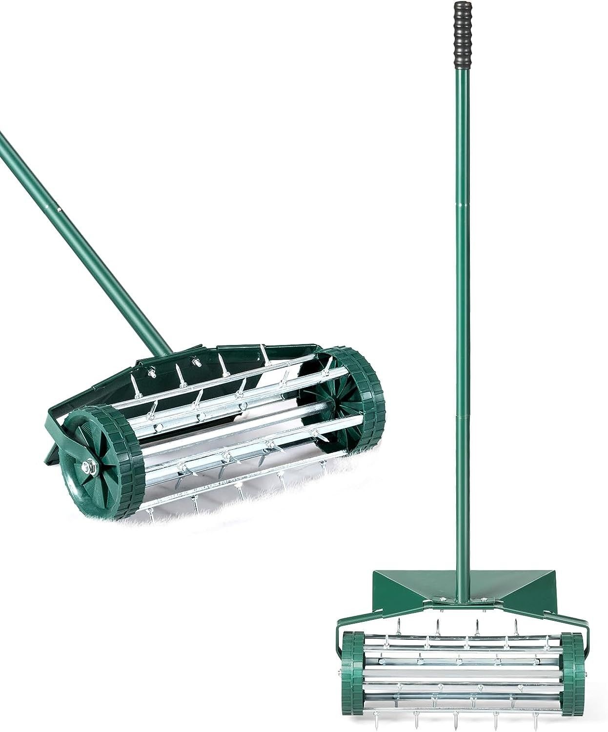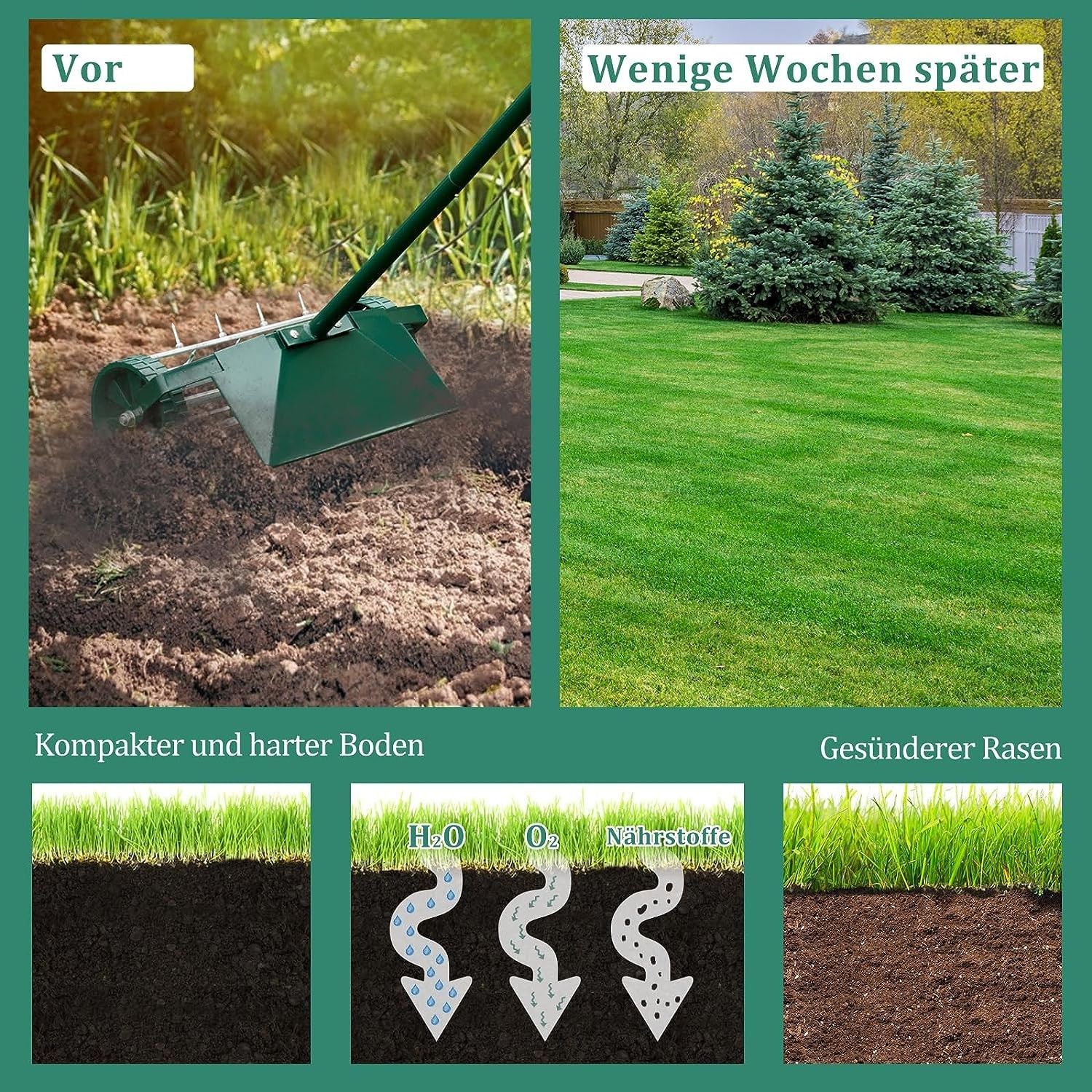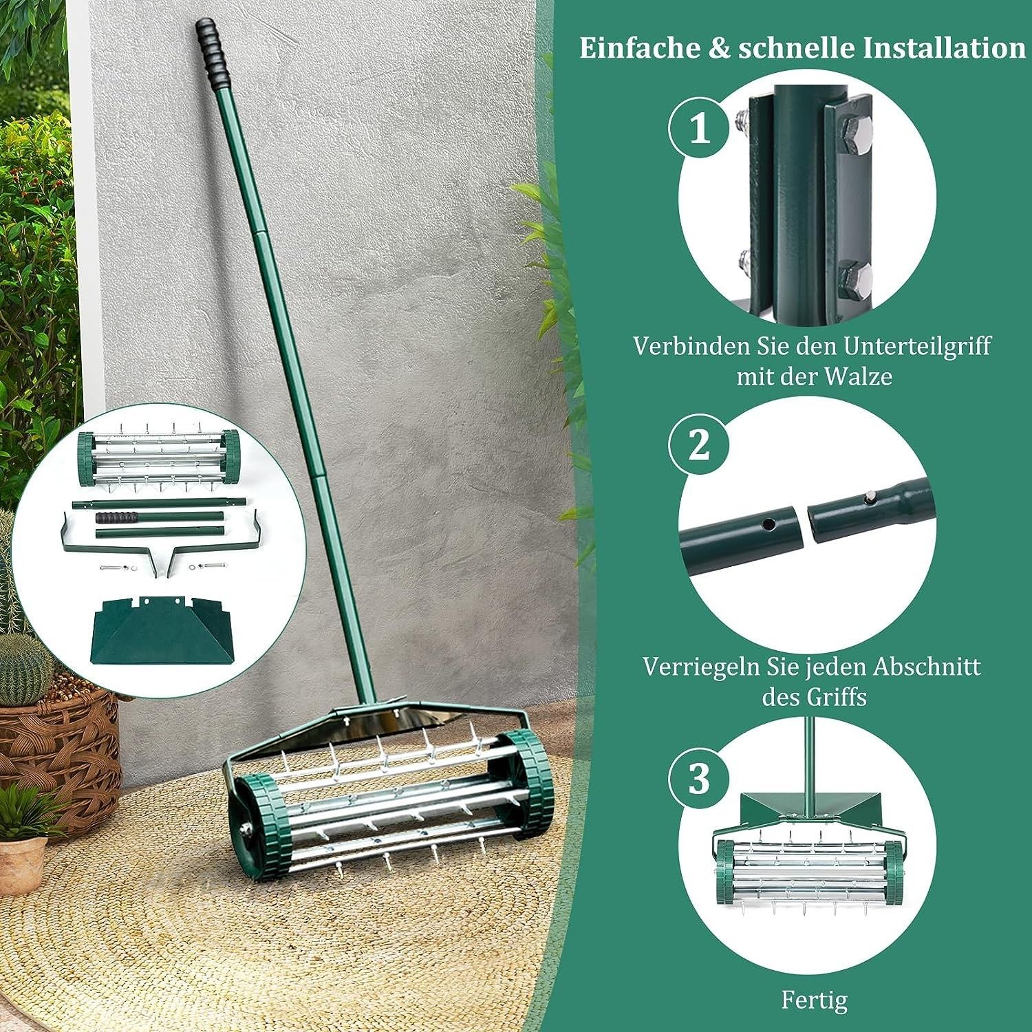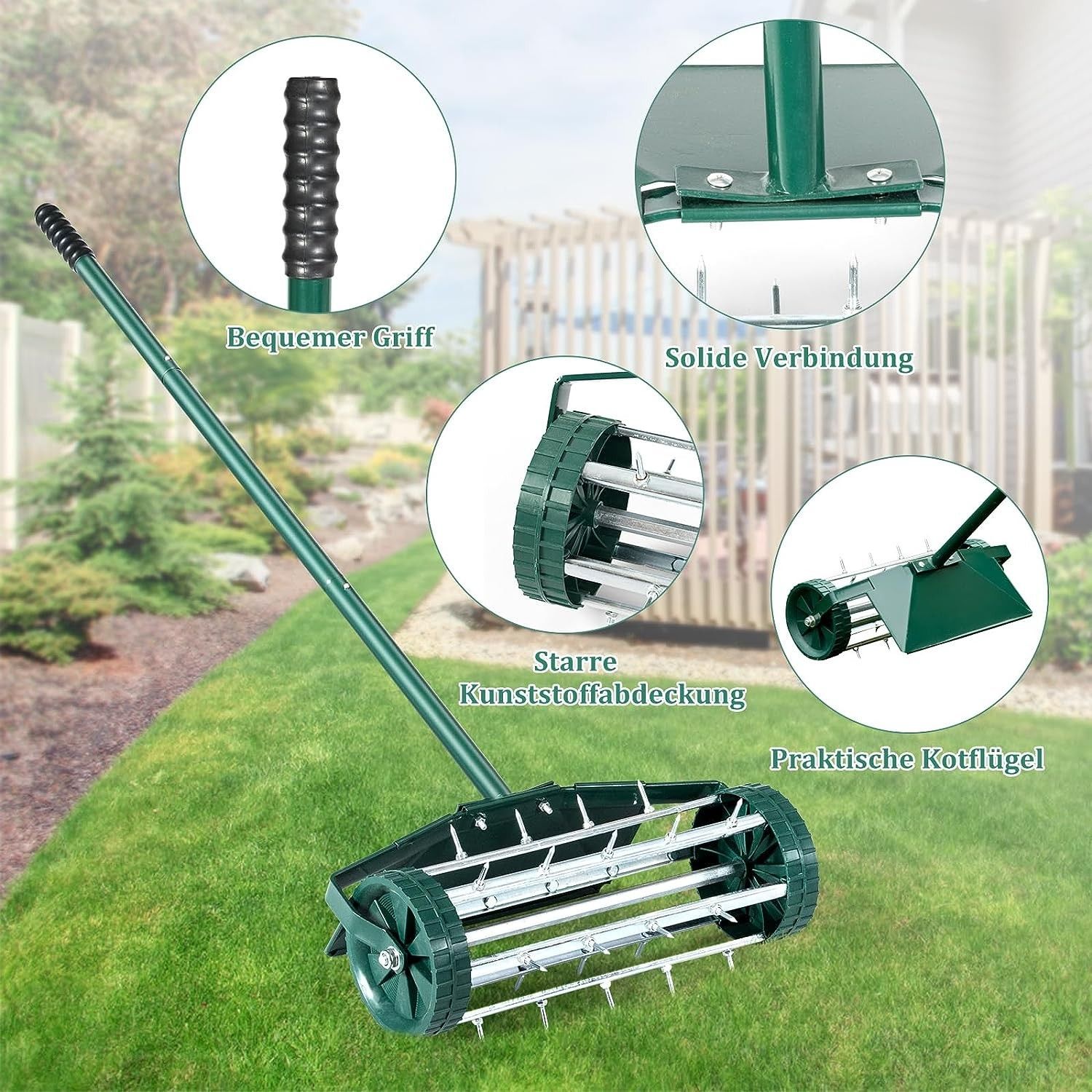 Rasenlüfter Walze, Rasenrolle mit Stiel & 3cm Nägeln & Spritzschutz, 46 x 23 x 127 cm