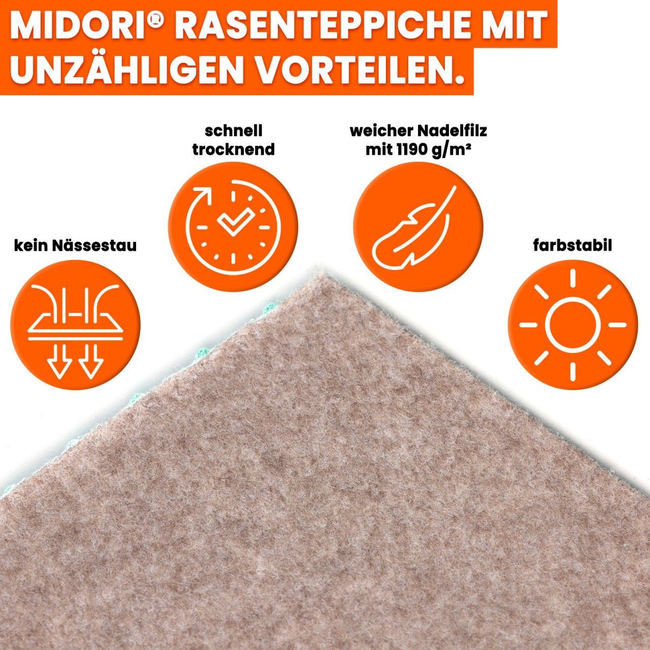 Rasenteppich 67 x 150 cm Beige mit Noppen Kunstrasen Teppich Balkon Terrasse Outdoor Premium Rasenteppich: Robust, farbstabil und vielseitig einsetzbar Unser hochwertiger Rasenteppich, auch bekannt als Balkonteppich oder Kunstrasen, bietet Ihnen eine erstklassige Alternative zu herkömmlichen Bodenbelägen im Außenbereich. Der MIDORI Rasenteppich besticht nicht nur durch seine Robustheit und Farbstabilität, sondern auch durch seine Vielseitigkeit in der Anwendung. Witterungsbeständig und farbstabil Gefertigt aus widerstandsfähigem Polyester, trotzt unser Rasenteppich allen Witterungseinflüssen wie Sonne, Regen und Schnee. Seine kräftigen Farben bleiben auch bei intensiver Nutzung lange erhalten, was ihn besonders langlebig und attraktiv macht. Wasserdurchlässig und schnell trocknend Die spezielle Struktur des Rasenteppichs ermöglicht eine effiziente Wasserabfuhr. Nach einem Regenschauer gelangt das Wasser unter den Teppich und kann durch die perforierte Trägerschicht sowie die Noppen an der Unterseite problemlos abfließen. So ist der Teppich schnell wieder trocken und einsatzbereit, ohne dass sich Wasser staut. Leicht verlegbar und pflegeleicht Die Verlegung unseres Rasenteppichs gestaltet sich denkbar einfach. Einfach ausrollen, gegebenenfalls die Ränder mit einem scharfen Cutter-Messer nachschneiden, und schon ist der Bodenbelag einsatzbereit. Auch die Reinigung gestaltet sich unkompliziert und kann mühelos mit einem Staubsauger durchgeführt werden. Angenehmes Trittgefühl und hohe Strapazierfähigkeit Der Rasenteppich bietet nicht nur eine ansprechende Optik, sondern auch ein angenehmes Trittgefühl. Sein extra weicher Nadelfilz mit 1190 g/m² sorgt für ein behagliches Gefühl unter den Füßen und lädt zum Verweilen ein. Zudem ist der Teppich äußerst strapazierfähig und kann selbst intensiver Nutzung standhalten. Umweltfreundlich und schadstoffgeprüft hergestellt Unser Rasenteppich wird nach europäischen Qualitätsstandards hergestellt und trägt das GUT-Label, welches die Prüfung auf Emissionen und Schadstoffe bestätigt. Wir legen Wert auf eine umweltfreundliche Produktion und garantieren Ihnen damit nicht nur höchste Qualität, sondern auch ein gutes Gewissen. Vielseitig einsetzbar für Ihren individuellen Bedarf Unser Rasenteppich eignet sich für eine Vielzahl von Anwendungen im Außenbereich. Ob als Poolunterlage, auf der Terrasse, dem Balkon oder als Outdoor-Bodenbelag – mit unserem Produkt schaffen Sie im Handumdrehen eine ansprechende und funktionale Gestaltung Ihres Außenbereichs. Entdecken Sie noch heute die unzähligen Möglichkeiten und genießen Sie die Vorzüge unseres hochwertigen Rasenteppichs. Produktdaten Art des Produkts: Vliesstoff Farbe: Beige Maße (B x L): 67 x 150 cm Material: 100% Polyester Teppichgewicht: 1190 g/m² Gesamthöhe: 4,5 mm Noppendrainage vorhanden: Ja Vlieshöhe: 3,7 mm DIN-Norm: EN 14041 Zertifikat: GUT