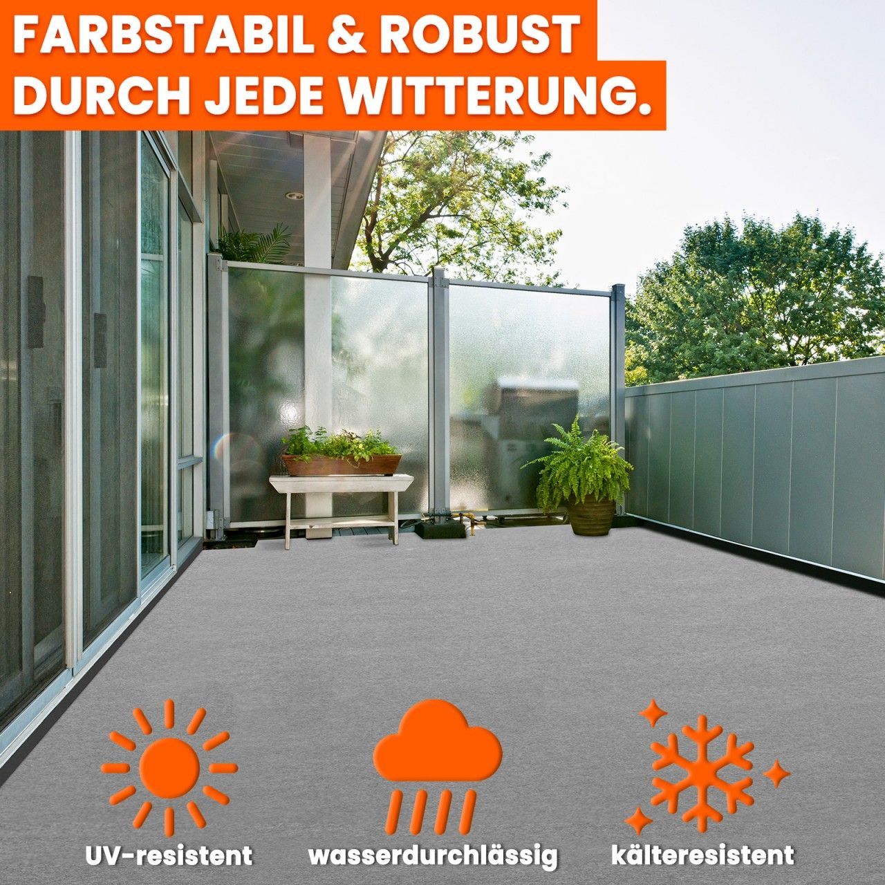Rasenteppich 67 x 150 cm Grau mit Noppen Kunstrasen Teppich Balkon Terrasse Outdoor Premium Rasenteppich: Robust, farbstabil und vielseitig einsetzbar Unser hochwertiger Rasenteppich, auch bekannt als Balkonteppich oder Kunstrasen, bietet Ihnen eine erstklassige Alternative zu herkömmlichen Bodenbelägen im Außenbereich. Der MIDORI Rasenteppich besticht nicht nur durch seine Robustheit und Farbstabilität, sondern auch durch seine Vielseitigkeit in der Anwendung. Witterungsbeständig und farbstabil Gefertigt aus widerstandsfähigem Polyester, trotzt unser Rasenteppich allen Witterungseinflüssen wie Sonne, Regen und Schnee. Seine kräftigen Farben bleiben auch bei intensiver Nutzung lange erhalten, was ihn besonders langlebig und attraktiv macht. Wasserdurchlässig und schnell trocknend Die spezielle Struktur des Rasenteppichs ermöglicht eine effiziente Wasserabfuhr. Nach einem Regenschauer gelangt das Wasser unter den Teppich und kann durch die perforierte Trägerschicht sowie die Noppen an der Unterseite problemlos abfließen. So ist der Teppich schnell wieder trocken und einsatzbereit, ohne dass sich Wasser staut. Leicht verlegbar und pflegeleicht Die Verlegung unseres Rasenteppichs gestaltet sich denkbar einfach. Einfach ausrollen, gegebenenfalls die Ränder mit einem scharfen Cutter-Messer nachschneiden, und schon ist der Bodenbelag einsatzbereit. Auch die Reinigung gestaltet sich unkompliziert und kann mühelos mit einem Staubsauger durchgeführt werden. Angenehmes Trittgefühl und hohe Strapazierfähigkeit Der Rasenteppich bietet nicht nur eine ansprechende Optik, sondern auch ein angenehmes Trittgefühl. Sein extra weicher Nadelfilz mit 1190 g/m² sorgt für ein behagliches Gefühl unter den Füßen und lädt zum Verweilen ein. Zudem ist der Teppich äußerst strapazierfähig und kann selbst intensiver Nutzung standhalten. Umweltfreundlich und schadstoffgeprüft hergestellt Unser Rasenteppich wird nach europäischen Qualitätsstandards hergestellt und trägt das GUT-Label, welches die Prüfung auf Emissionen und Schadstoffe bestätigt. Wir legen Wert auf eine umweltfreundliche Produktion und garantieren Ihnen damit nicht nur höchste Qualität, sondern auch ein gutes Gewissen. Vielseitig einsetzbar für Ihren individuellen Bedarf Unser Rasenteppich eignet sich für eine Vielzahl von Anwendungen im Außenbereich. Ob als Poolunterlage, auf der Terrasse, dem Balkon oder als Outdoor-Bodenbelag – mit unserem Produkt schaffen Sie im Handumdrehen eine ansprechende und funktionale Gestaltung Ihres Außenbereichs. Entdecken Sie noch heute die unzähligen Möglichkeiten und genießen Sie die Vorzüge unseres hochwertigen Rasenteppichs. Produktdaten Art des Produkts: Vliesstoff Farbe: Grau Maße (B x L): 67 x 150 cm Material: 100% Polyester Teppichgewicht: 1190 g/m² Gesamthöhe: 4,5 mm Noppendrainage vorhanden: Ja Vlieshöhe: 3,7 mm DIN-Norm: EN 14041 Zertifikat: GUT