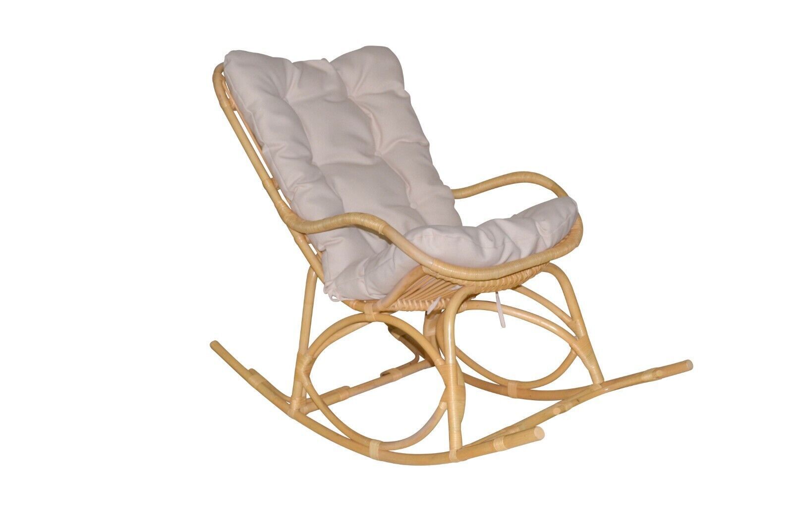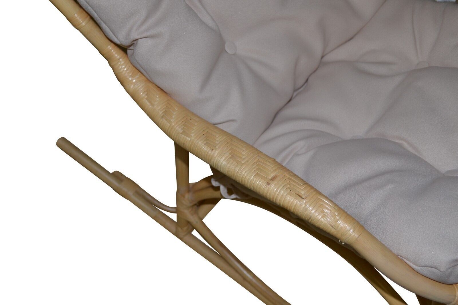 Rattan Schaukelstuhl mit Auflage Farbe: naturfarben gebeizt und lackiert Moderner Schaukelstuhl komplett aus Rattan, handgeflochten - reine Handarbeit. Kissenauflage extra stark gefüllt mit einer softweichen Vliesfüllung. Mit Knopfsteppung und Befestigungsbändchen. Bezug 100% Polyester, Cremefarben.