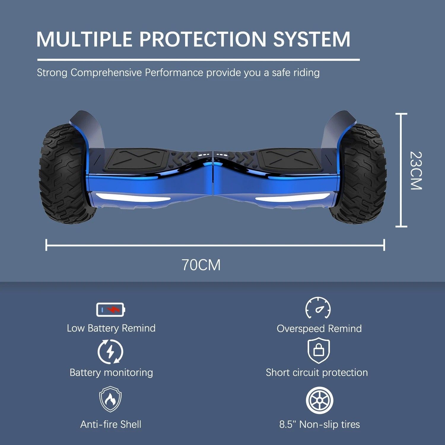 8.5" all-terrain hoverboard with APP control, integrated LED lights, and Bluetooth speakers. Powerful motor for smooth rides. Ideal for outdoor fun and electric skateboard enthusiasts.