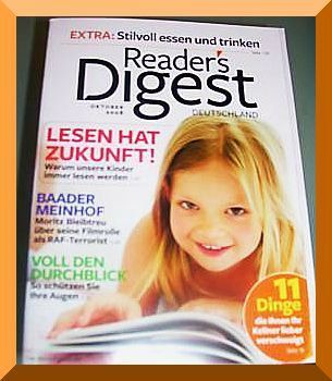 *** WILLKOMMEN! DANKE FÜR IHR INTERESSE! *** +++ Reader´s Digest Deutschland +++ Lesen hat Zukunft! Magazin Oktober 2008 Farbig illustriert. Deutsch. Auszug der Artikel: Lesen hat Zukunft! Baader Meinhof: Moritz Bleibtreu... Voll den Durchblick: So schützen Sie Ihre Augen EXTRA: Stilvoll essen