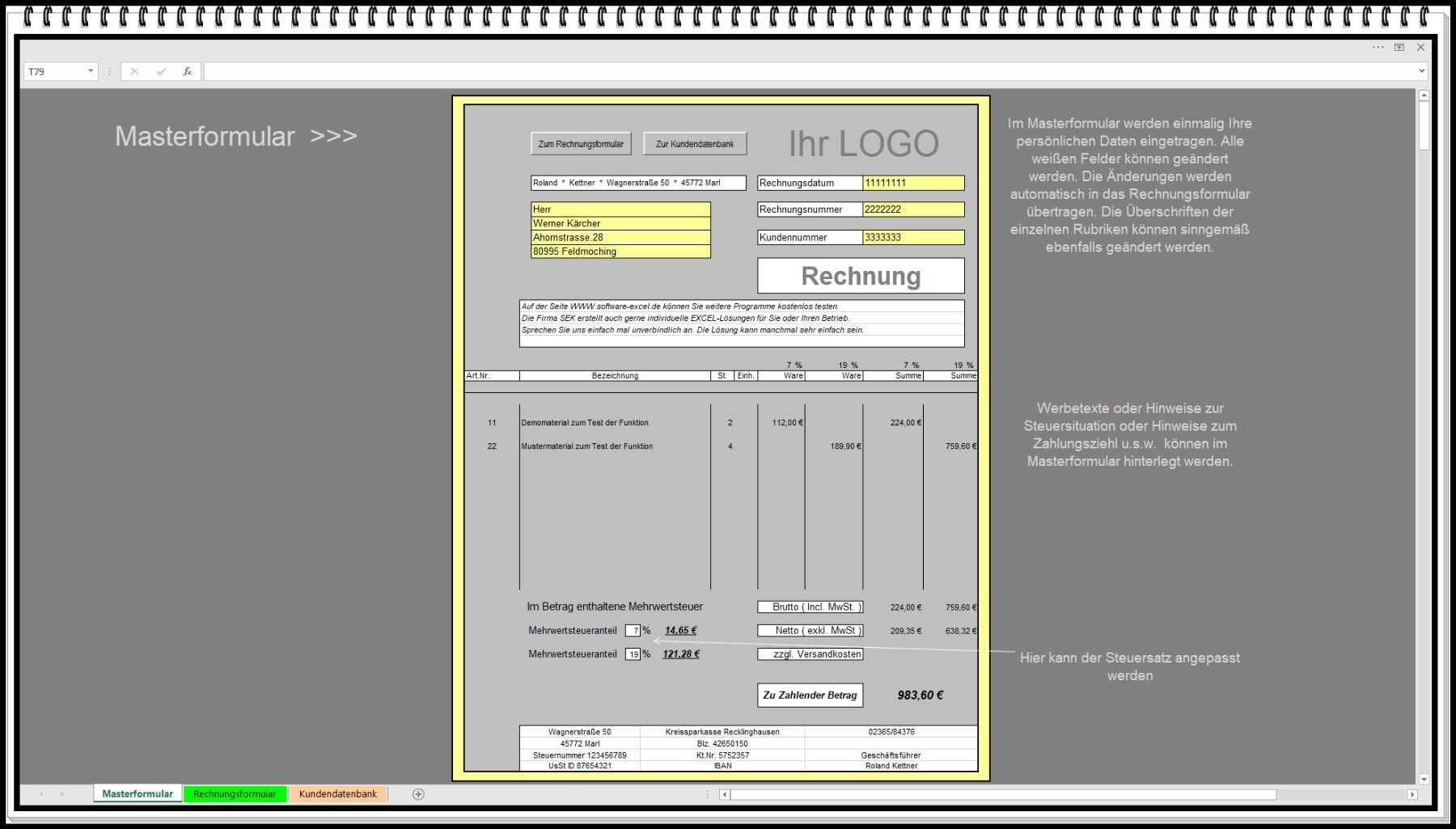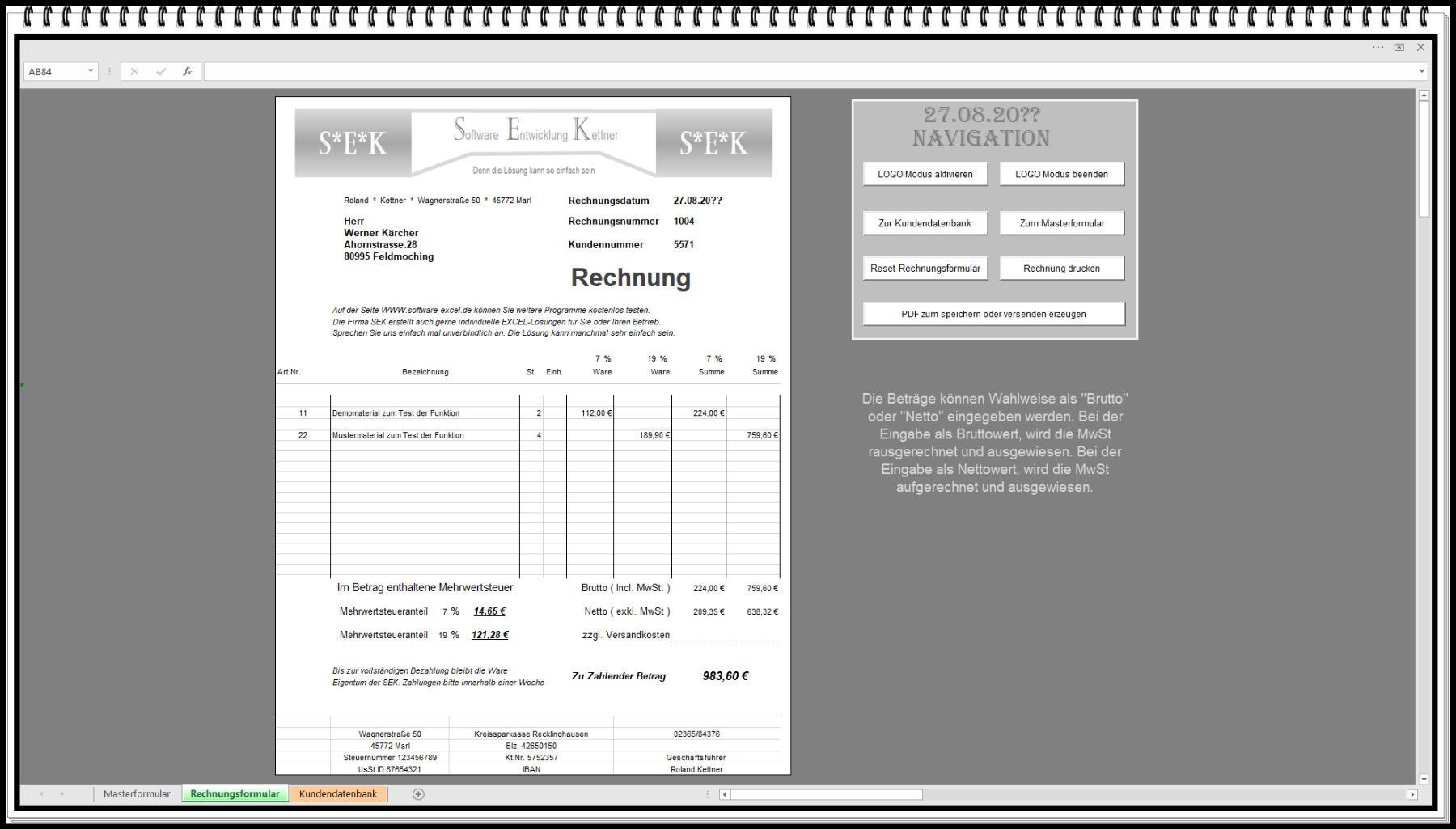Rechnungsprogramm Easy Faktura mit top Kundendatenbank zwei Steuersätze § 19 geeignet