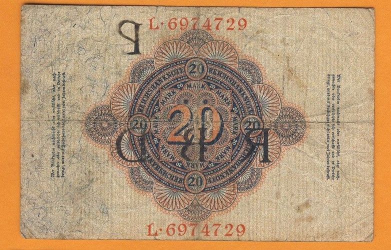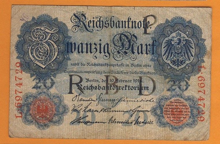 Rechsbanknote 20 Mark Berlin Feb.1914 Scheinnummer L - 6974729