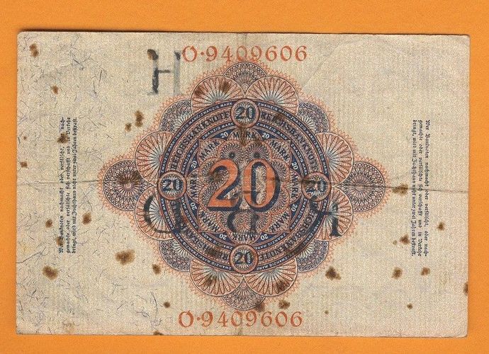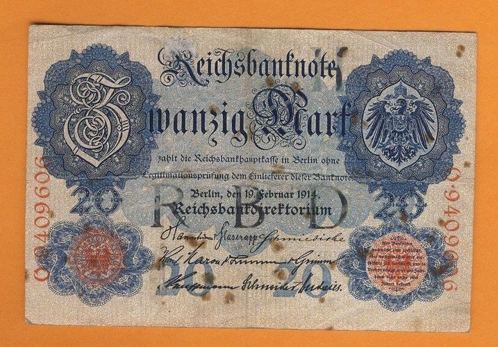 Rechsbanknote 20 Mark Berlin Feb.1914 Scheinnummer O - 9409606