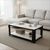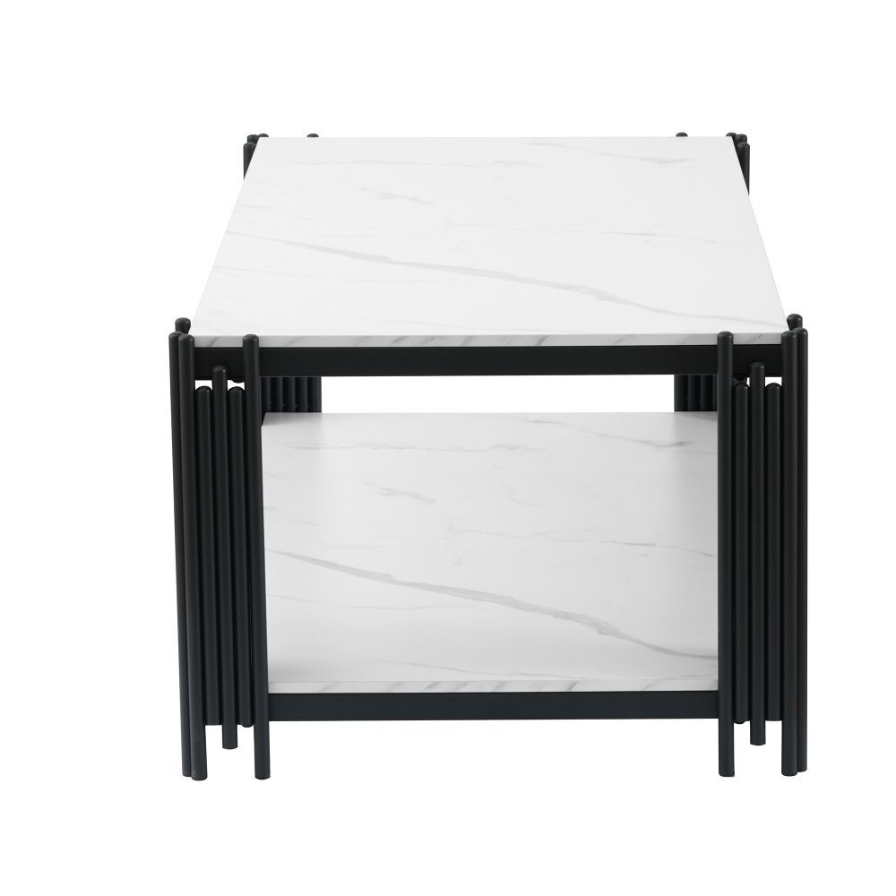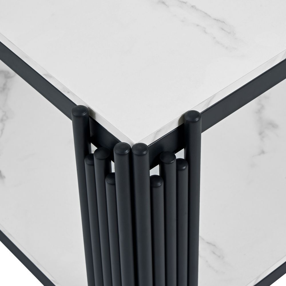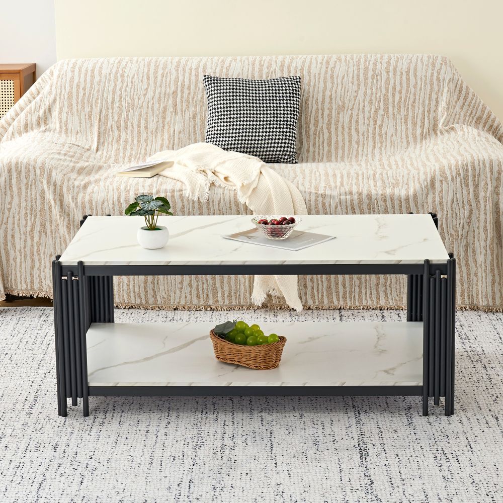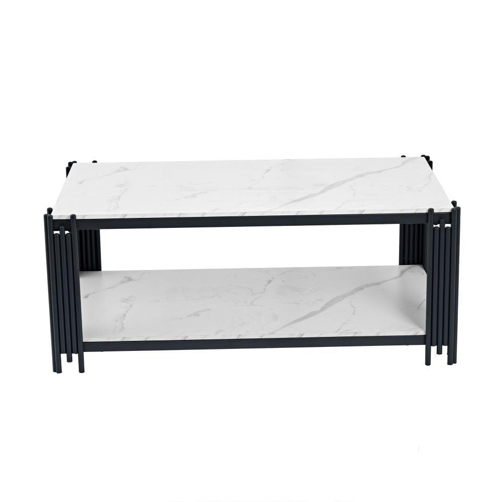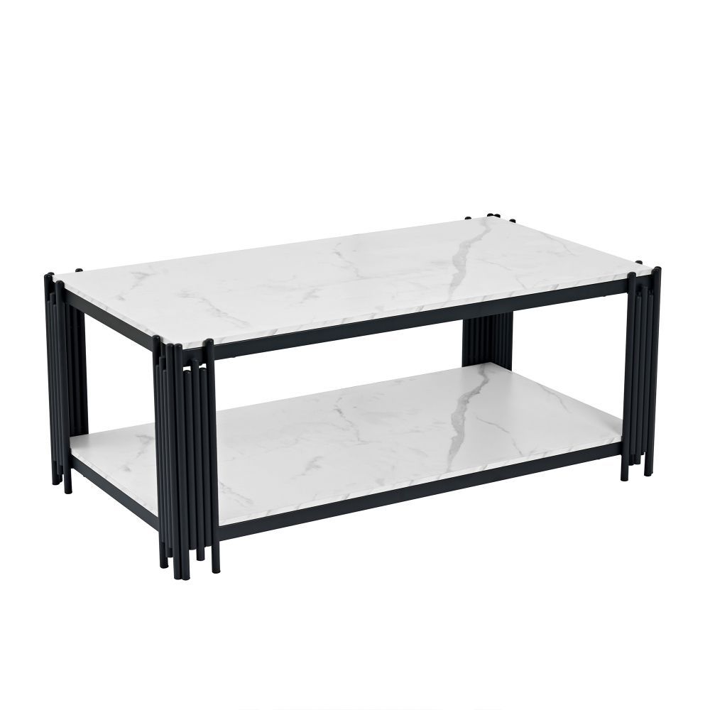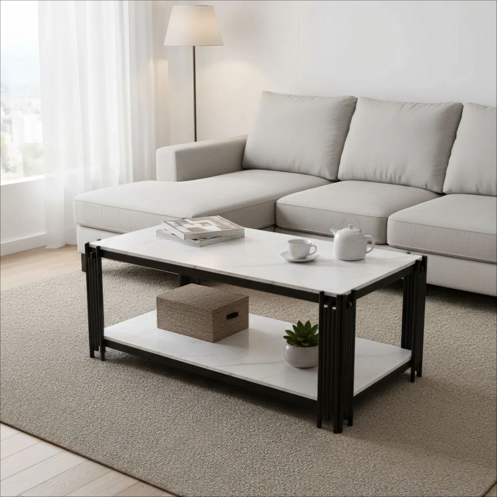 Moderner rechteckiger Couchtisch mit eleganter marmorierter Tischplatte und stabilen Metallbeinen. Das stilvolle Design in Weiß und Schwarz passt ideal zu verschiedenen Wohnzimmer-Einrichtungen und verleiht dem Raum eine zeitgemäße, edle Note. Gefertigt aus MDF und Metall, überzeugt der Tisch durch eine robuste Konstruktion und eine pflegeleichte Oberfläche. Ideal als praktische Ablage für Getränke, Bücher oder Dekoration im Wohnbereich.