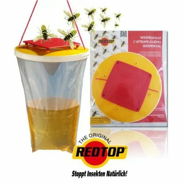 REDTOP Wespenfalle REDTOP Wespenfalle Beschreibung: Natürliches Fallensystem mit starkem Lockstoff. Hochwirksame Einweg Wespenfalle mit Top-Fangleistung für den Außenbereich. Besonders effizient in den Sommermonaten. Nützlinge wie Bienen und Hummeln werden nicht angelockt. Tolle Handhabung mit einer