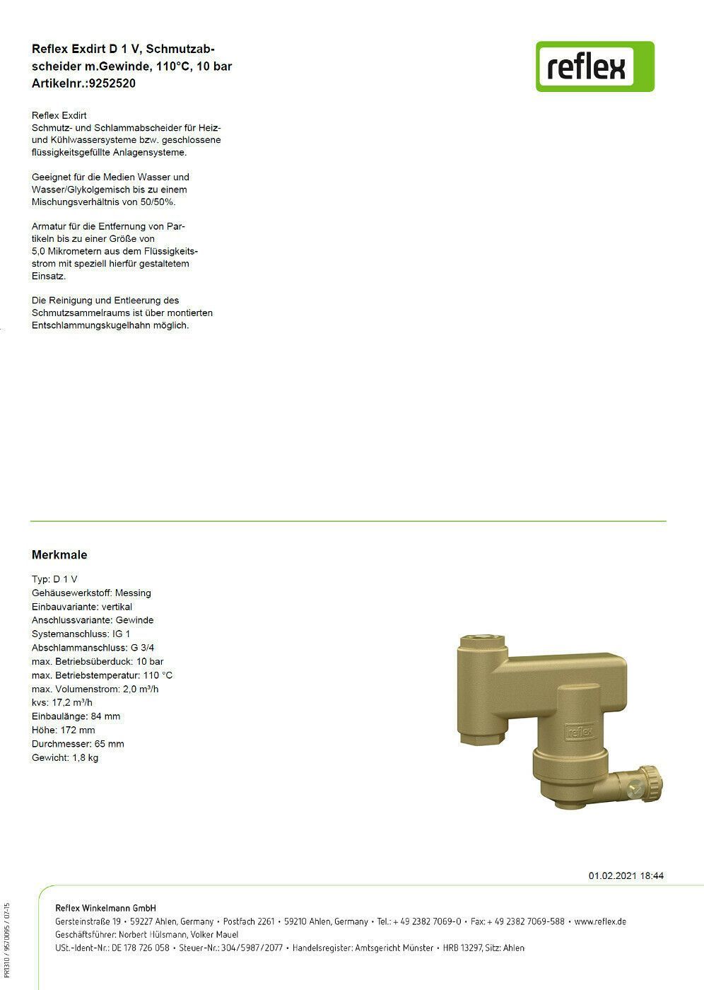 Reflex Schmutzabscheider Schlammabscheider exdirt D 1" V vertikal Messing 10 bar