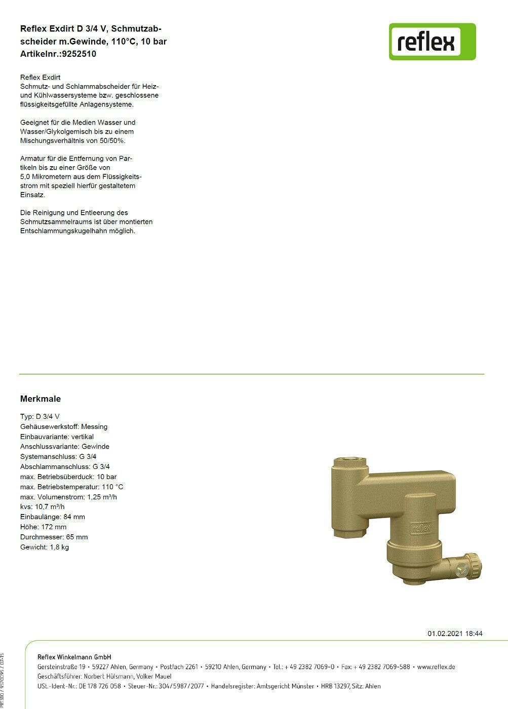 Reflex Schmutzabscheider Schlammabscheider exdirt D 3/4" V vertikal 10 bar