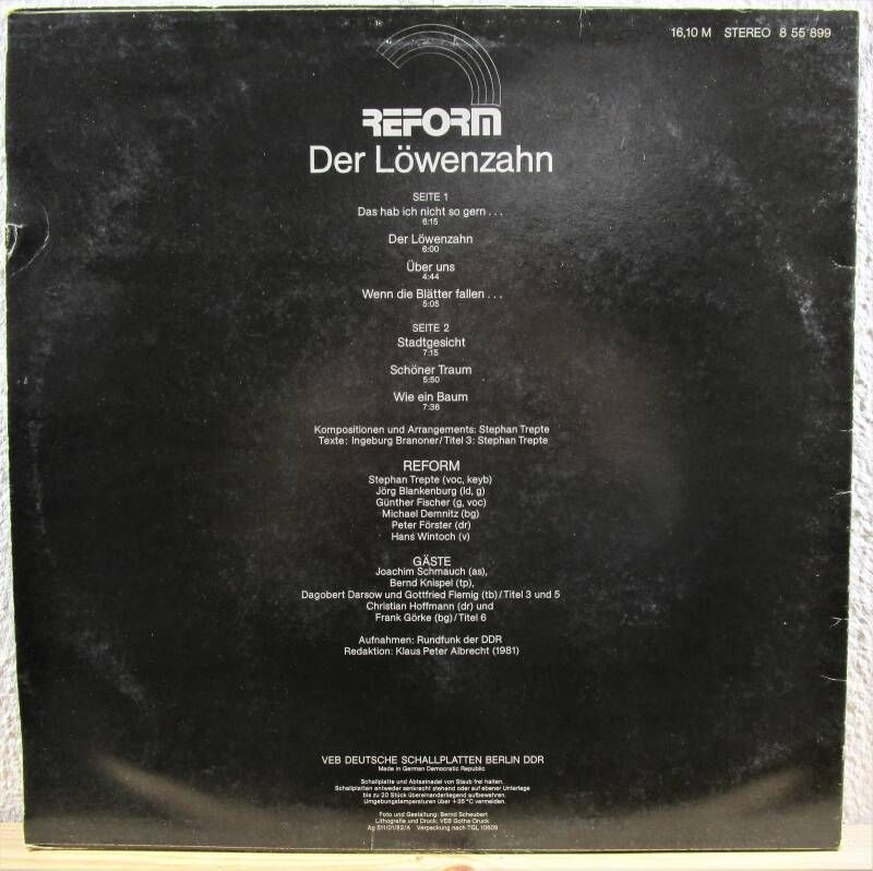 Reform - Der Löwenzahn Amiga 8 55 899 1982 Vinyl: VG+ Cover: VG Das Hab ich nicht so gern 6:15 Der Löwenzahn 6:00 Über uns 4:44 Wenn die Blätter fallen 5:05 Stadtgesicht 7:15 Schöner Traum 5:50 Wie ein Baum 7:36 Hersteller EU Verantwortliche Person Lieferzeit 3 - 6 Tage