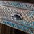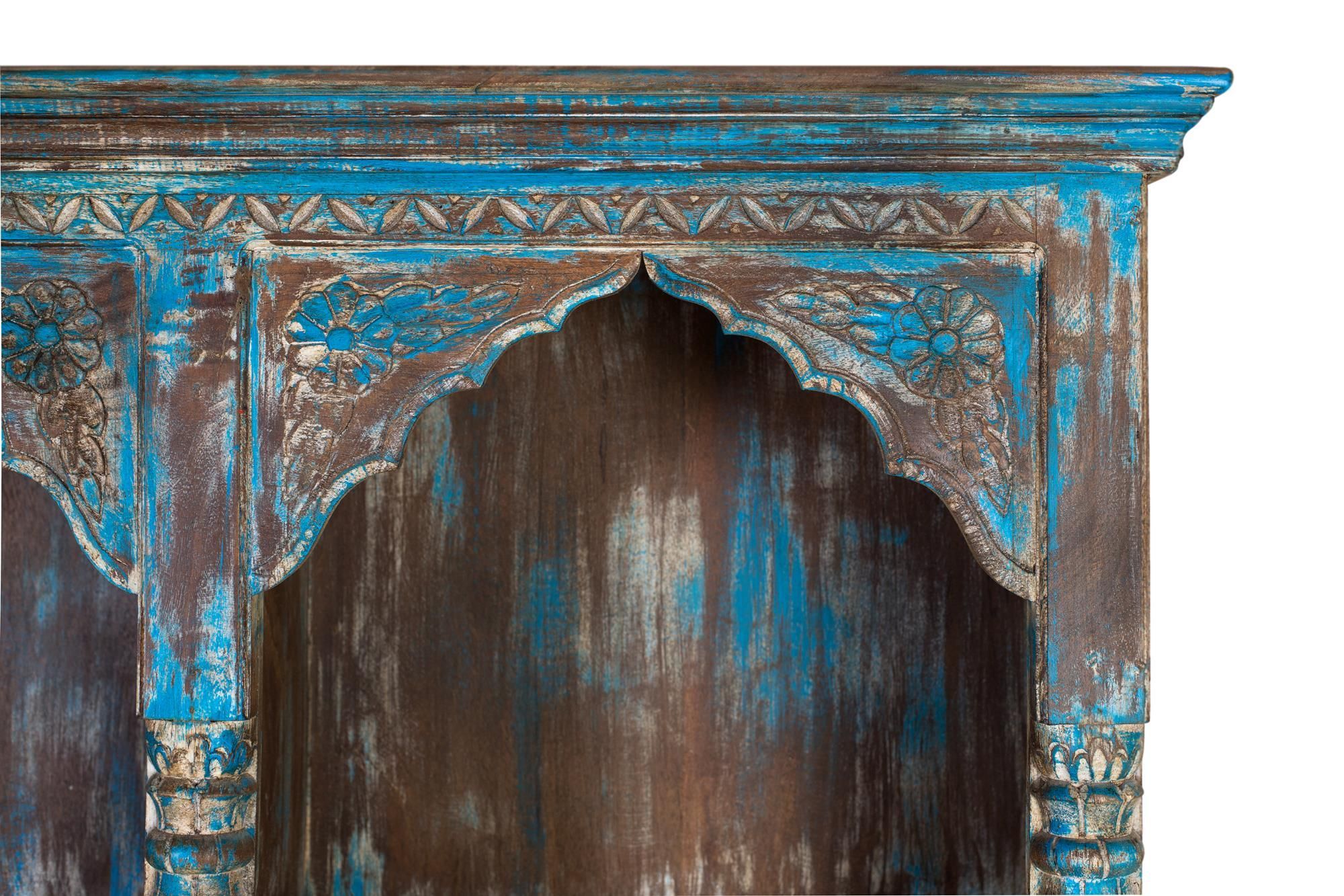 Dieses Bécherregal im exotischen Stil ist ein atemberaubendes Möbelstéck, sorgfältig von Hand geschnitzt und in einer bezaubernden antiken blauen Farbe bemalt. Das mit sorgfältiger Handwerkskunst bearbeitete Holz weist komplizierte Muster und Details auf, die ein fér exotische Designs typisches Gefé