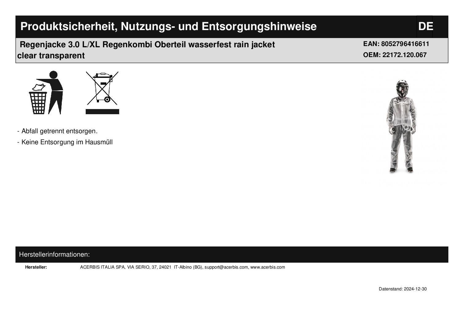 Acerbis Regenjacke 3.0 L/XL Regenkombi Oberteil wasserfest rain jacket clear transparent
