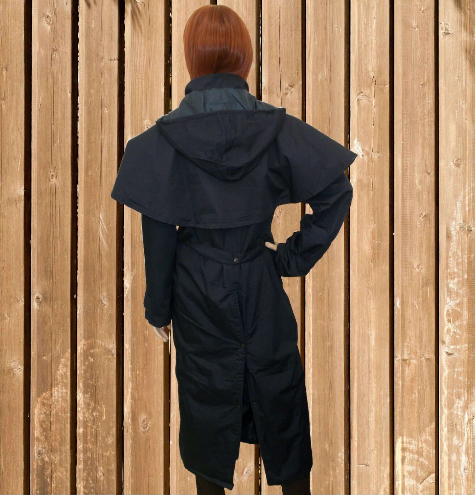 Bywater Regen-Reitmantel · Regenmantel zum reiten, warm gefüttert · Vorne zum Knöpfen · hinten mit Schlitz zum aufknöpfen · mit großer Schultercape · Stehkragen, innen mit Cord · Regulierbare Ärmelweite · Leicht wattiert und innen mit Fleece gefüttert