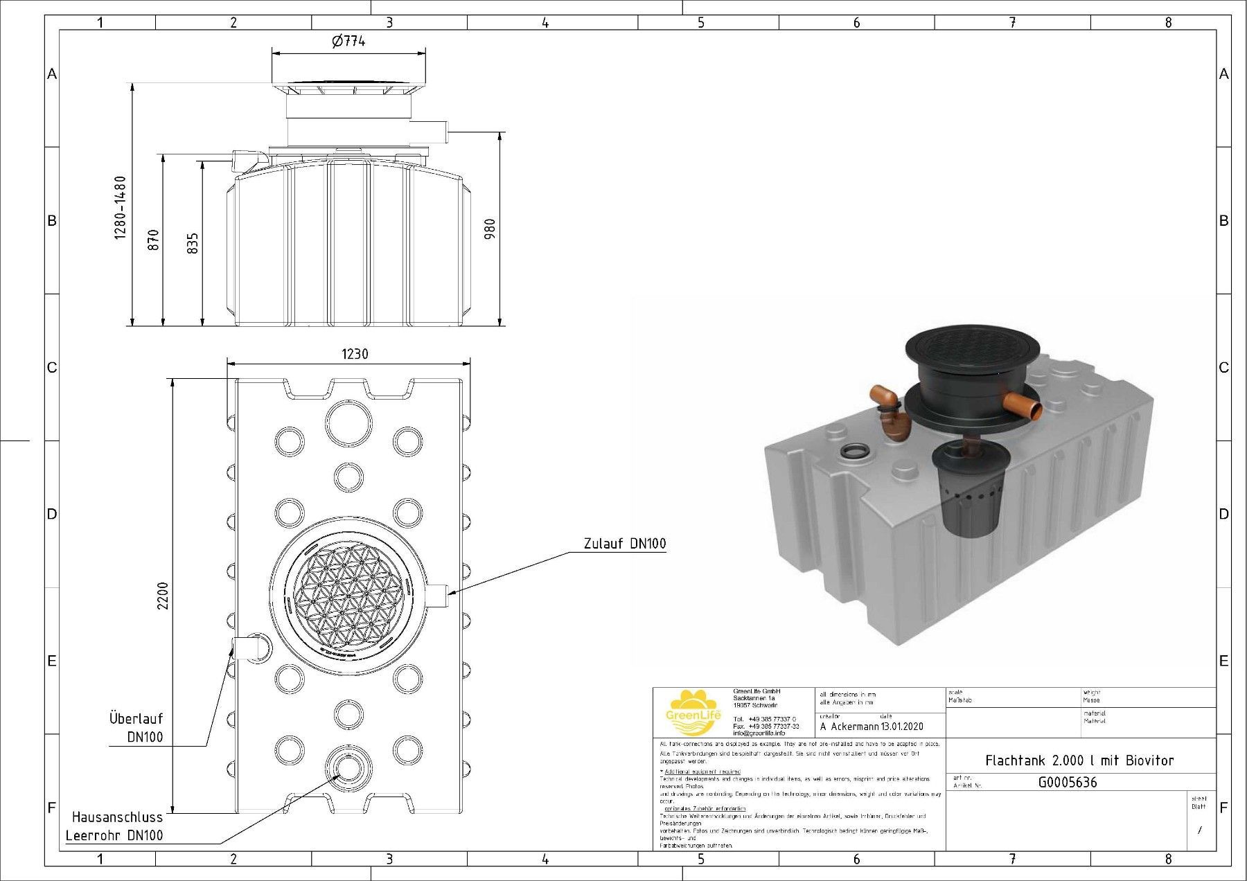 Flachtank 2.000 Liter inklusive Ausgleichsdom (ausziehbar von 380 - 580 mm) mit begehbarer Abdeckung und 3 Anschlüssen DN 110 Technische Daten Material: Polyethylen Gewicht in kg: 90 Nutzvolumen: 2.000 Liter Länge in mm: 2.200 Breite in mm: 1.200 Höhe in mm: 1.280-1.480 Anschlüsse: DN 110 Produktinf