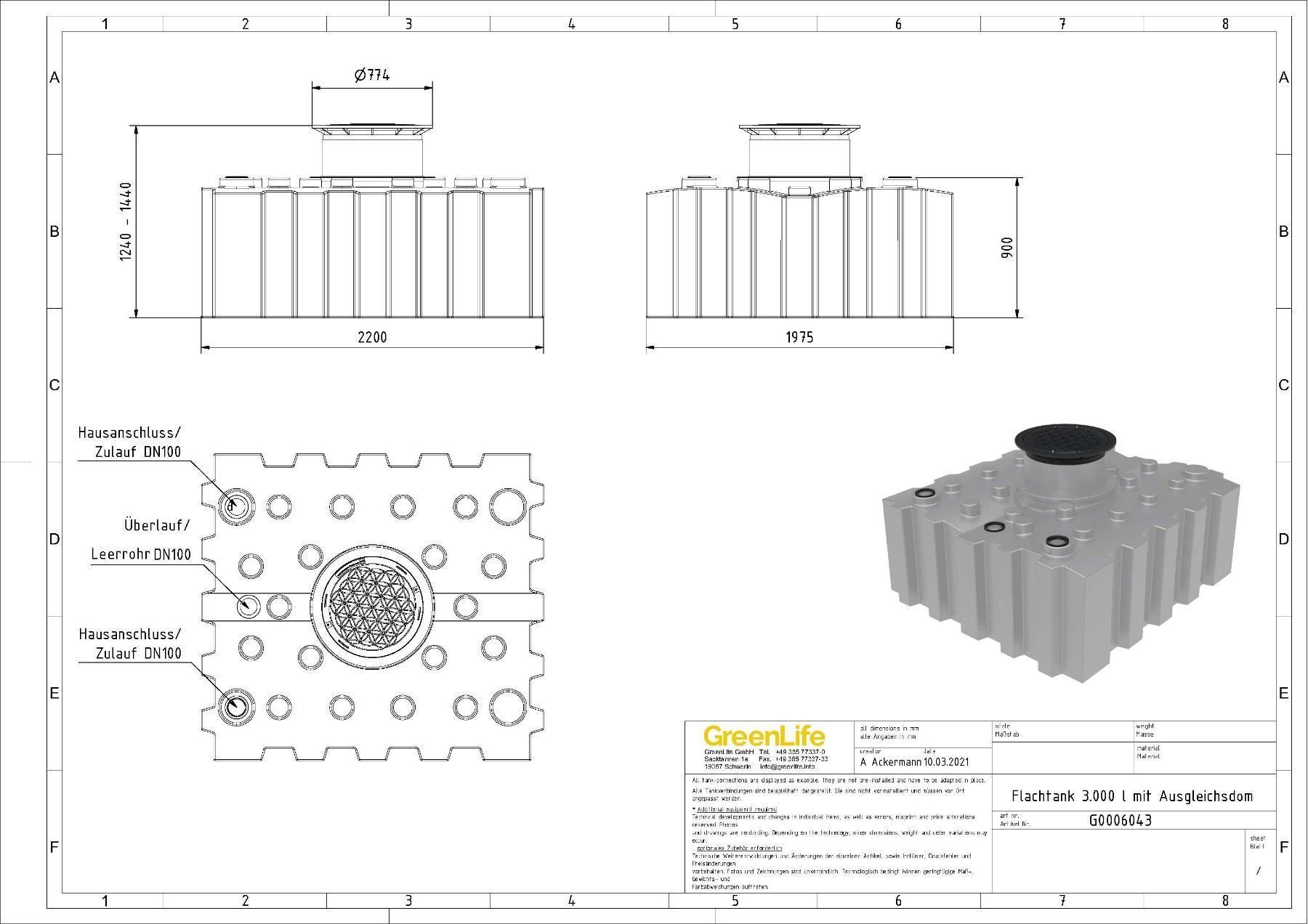 Regensammler Flachtank 3000 Liter inklusive Ausgleichsdom (ausziehbar von 380 - 580 mm) mit begehbarer Abdeckung und 3 Anschlüssen DN 110 Der 3.000 l Flachtank ist mit einem Biovitor - dem biologischen Regenwasserfilter - ausgestattet. Technische Daten Material: Polyethylen Gewicht in kg: 140 Nutzvo