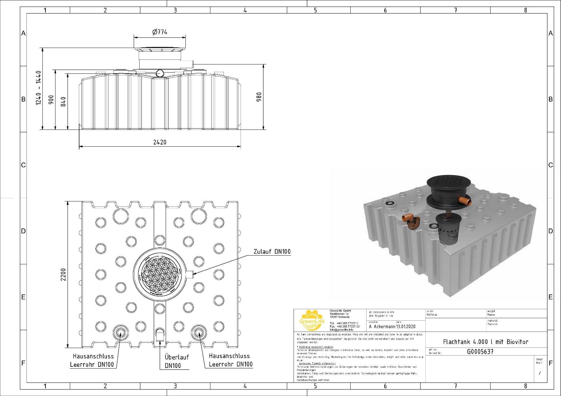 Flachtank 4.000 Liter inklusive Ausgleichsdom (ausziehbar von 380 - 580 mm) mit begehbarer Abdeckung und 3 Anschlüssen DN 110 Technische Daten Material: Polyethylen Gewicht in kg: 190 Nutzvolumen: 4.000 Liter Länge in mm: 2.420 Breite in mm: 2.200 Höhe in mm: 1.240-1.440 Anschlüsse: DN 110 Der Biovi