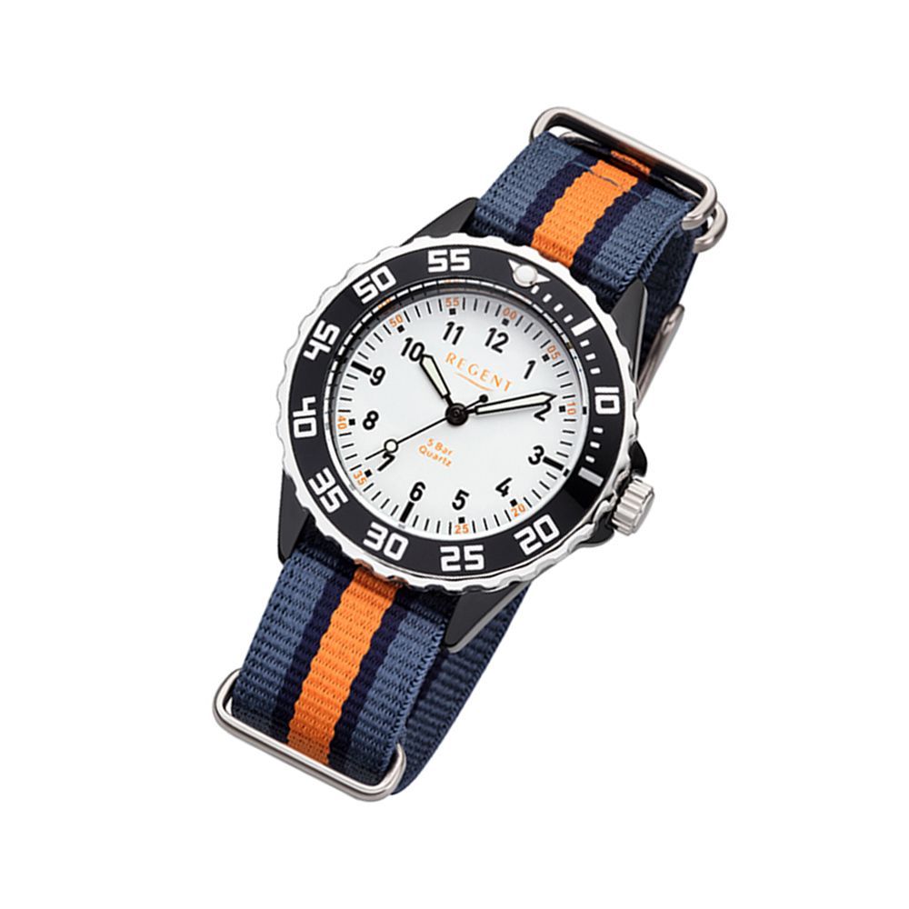 Die Analoguhr der Marke Regent verfügt über ein Quarzwerk und hat ein schönes Armband aus Textil in blau orange mit Dornschließe. Die Uhr aus der Regent Kinderuhren Kollektion für Kinder Jugend hat ein Zifferblatt in der Farbe weiß gepaart mit einer Mineralglas-Abdeckung. Die Form der trendigen Uhr