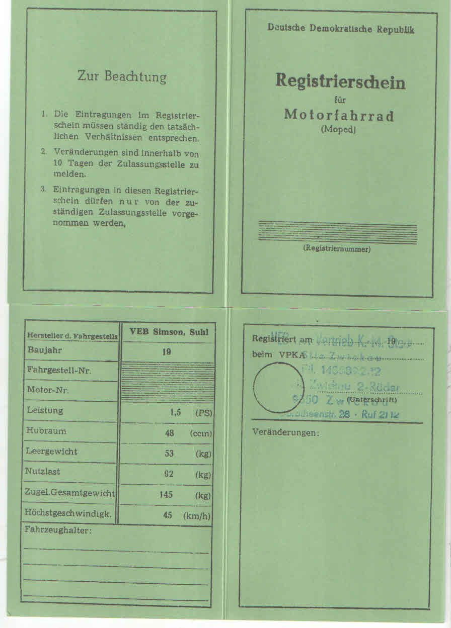 Registrierschein Betriebserlaubnis ABE SIMSON SR 2 Mofa Moped, Motorfahrrad, DDR