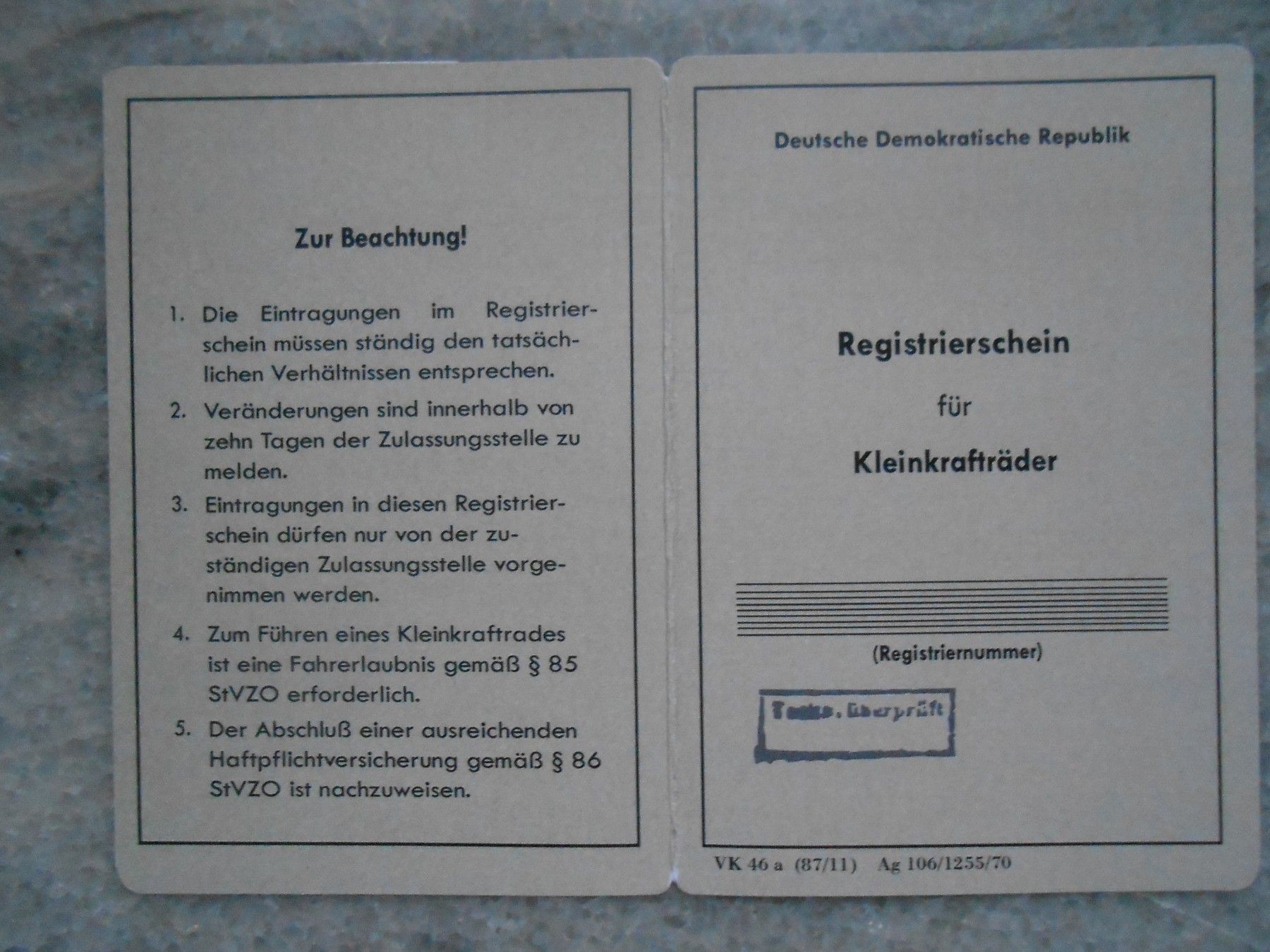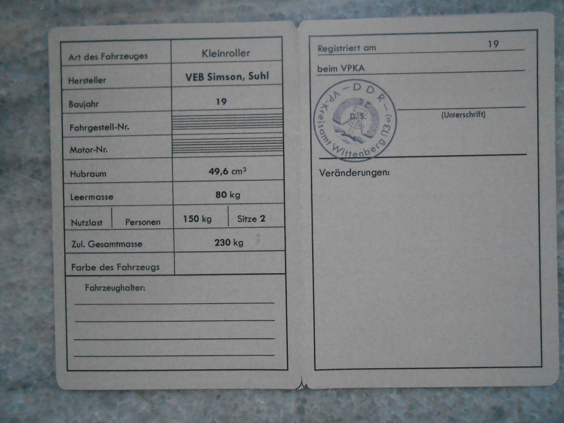 Registrierschein für Kleinkrafträder Stempel, Simson
