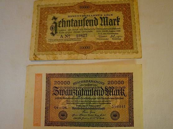 Normal 0 21 Angeboten werden folgende Papiere (B): Zehntausend Mark Handwerkskammer Köln von 1923. Zwanzigtausend Mark Reichsbanknote von 1923 Versandkosten EUR 1,20 - unversichert. Bei unversichertem Versand geht das Risiko voll zu Lasten des Käufers! Zustand: gebraucht, Klebereste rückseitig, sieh