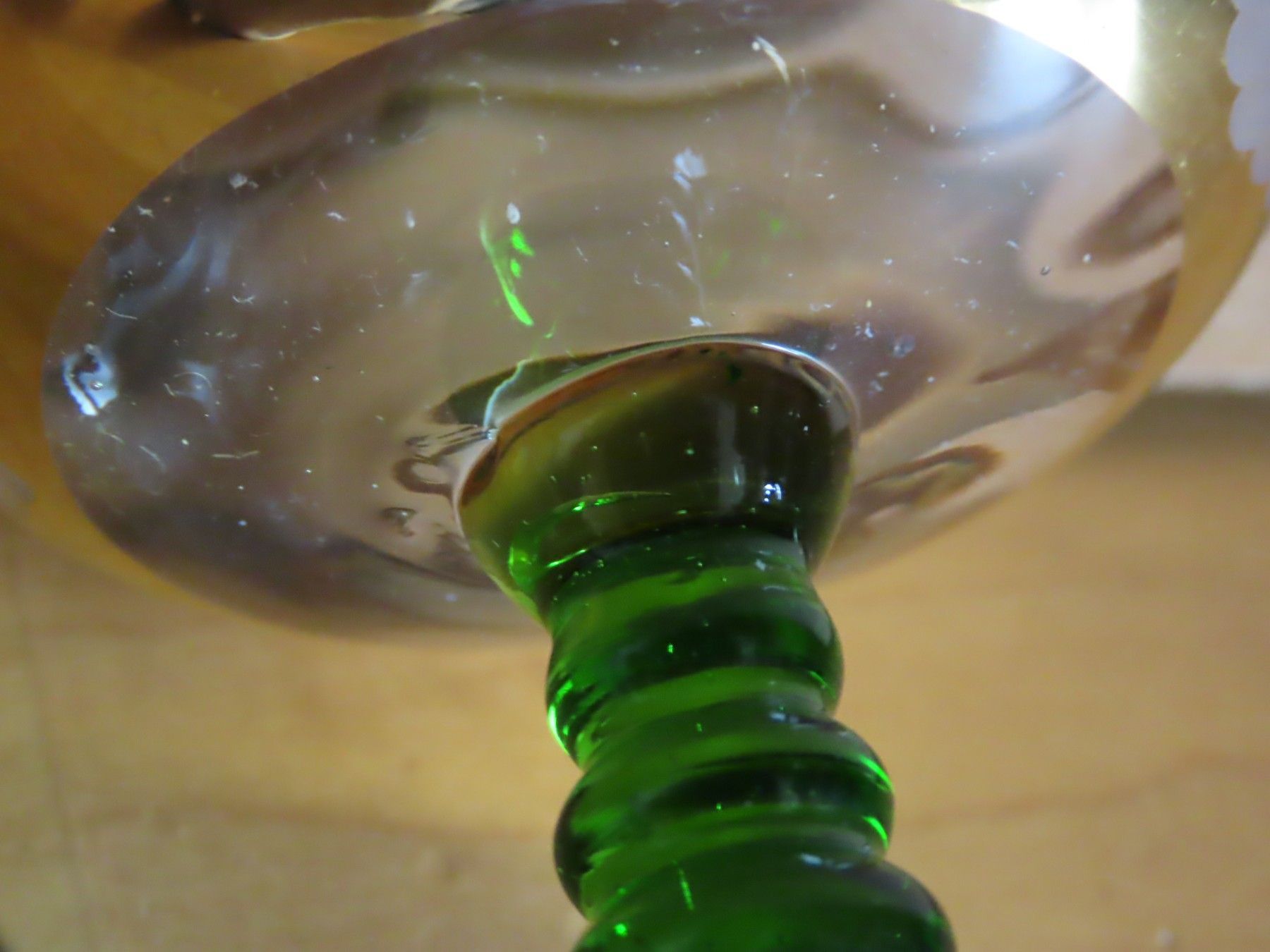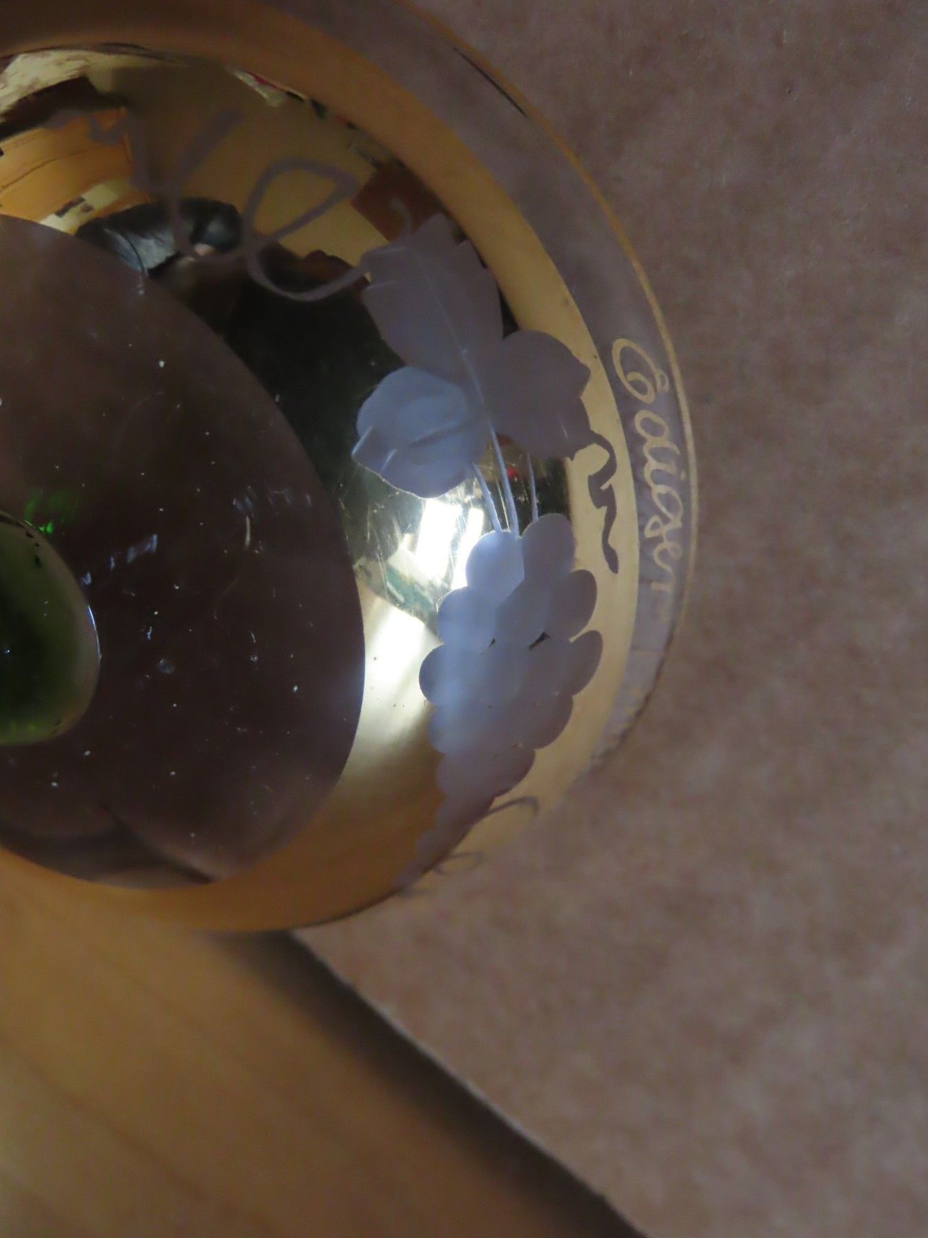 Maße: ca.6,8 cm hoch x ca. 6,5 cm Durchmesser --immer die breiteste Stelle gemessen die Öffnung hat einen Durchmesser von ca. 6,4 cm Der Standfuß hat einen Durchmesser von ca. 4,3 cm Material: Glas ist leicht verschmutzt, hat feine Kratzer