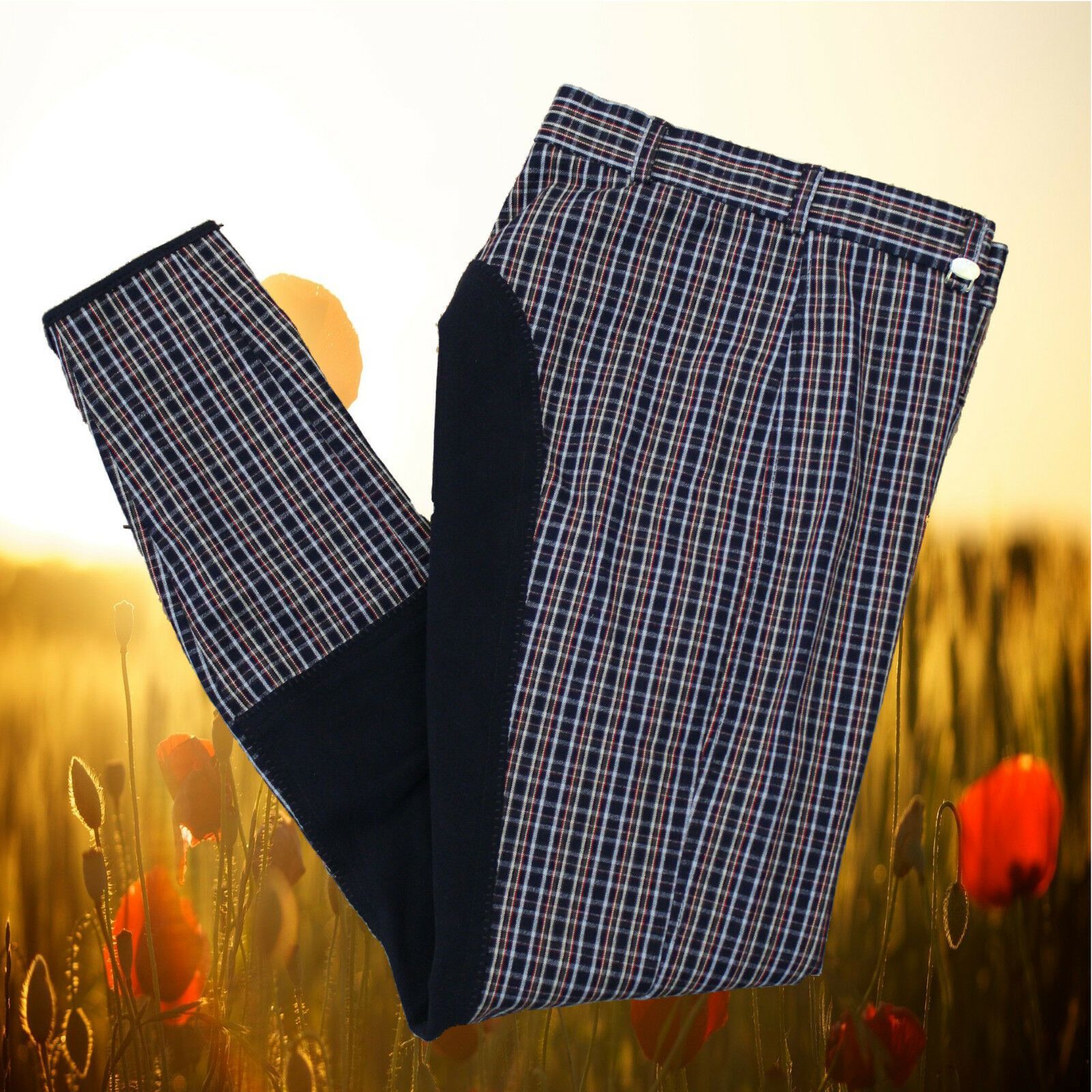 Reithose Liverpool Check · Moderne Reithose · Vollbesatzhose · Im Karo-Design · Klassischer Schnitt mit mittlerer Taillenhöhe · Elastikbund · Eine Reißverschlusstasche · Beinabschluss mit Klettverschluss · Anit-slip Besatz aus elastischem Kunstleder · Besatz aus elastischem Kunstleder Material Obers
