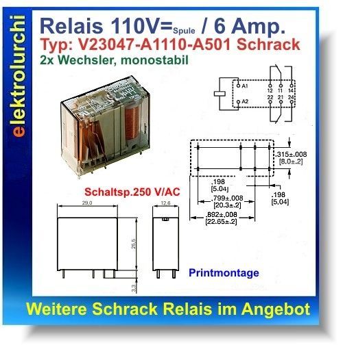 Schrack Relais Spule 110V/ DC, Schrack: V23047-A1110-A501, 2 Wechsler, 250V AC/6Amp 1St
