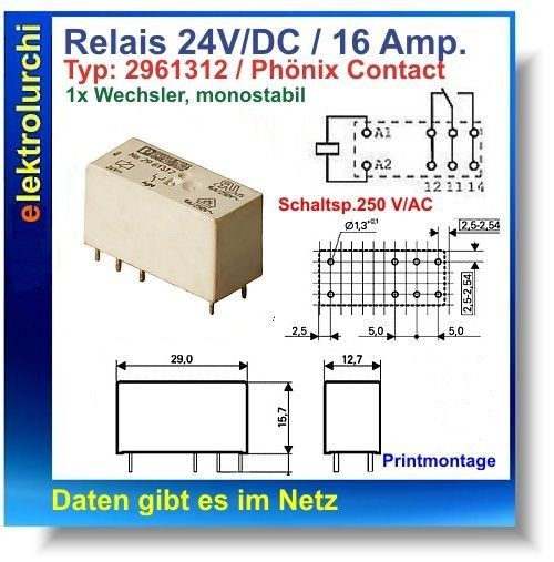 Relais Spule 24V/ DC, PhoenixContact: 2961312, 1 Wechsler, 250V AC/16Amp. 1St
