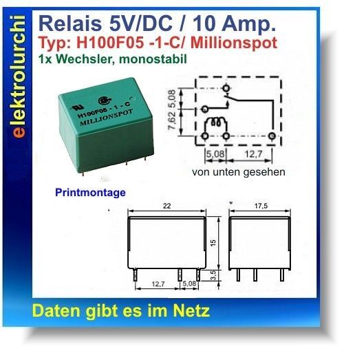 Relais Spule: 5V/ DC, Millionspot: H100F05, 1 Wechsler, 250VAC/10Amp. 1St