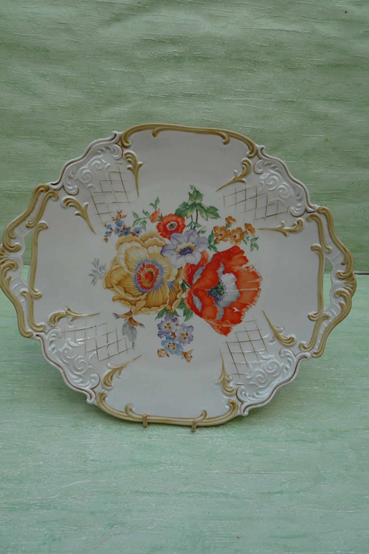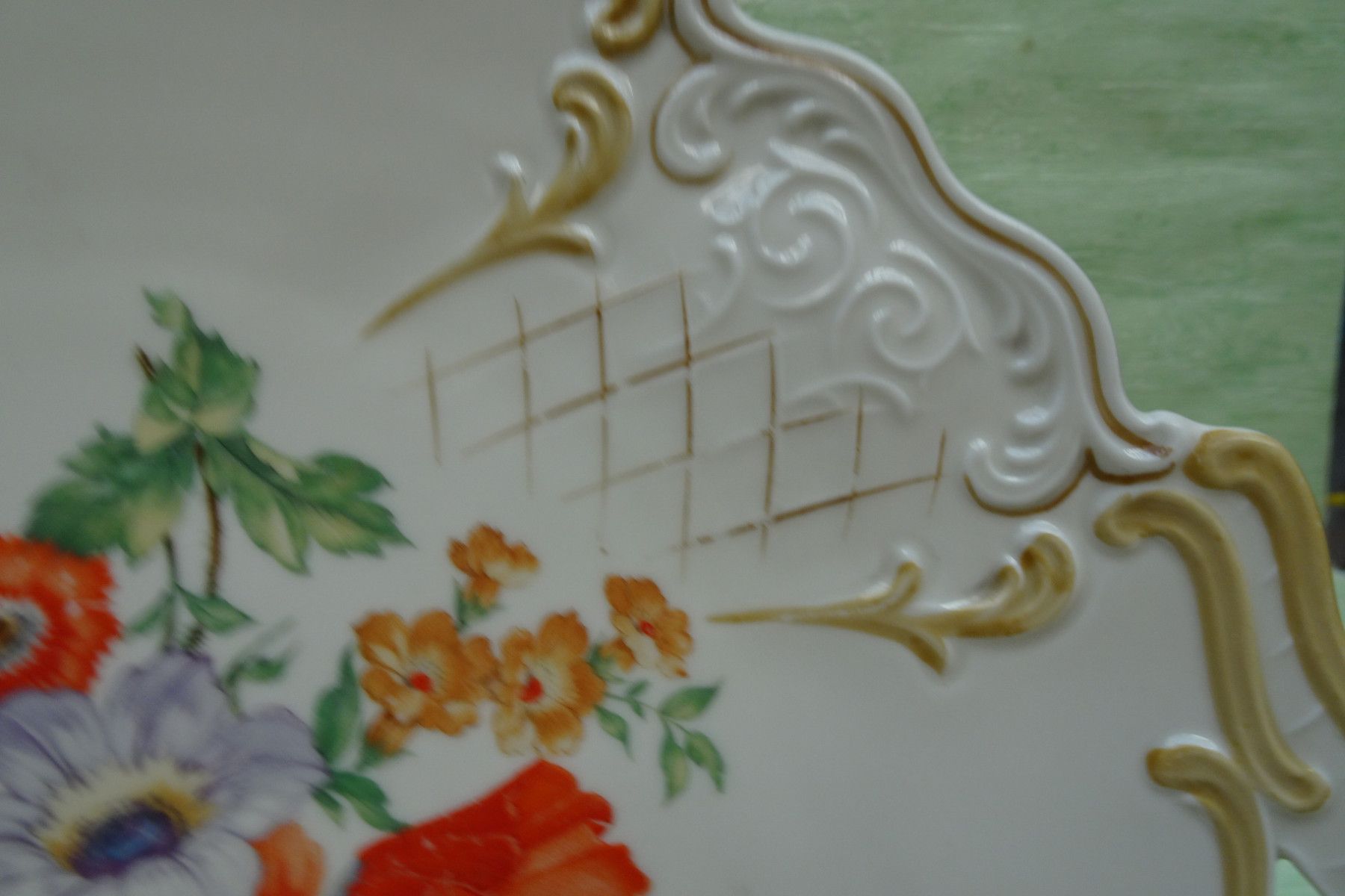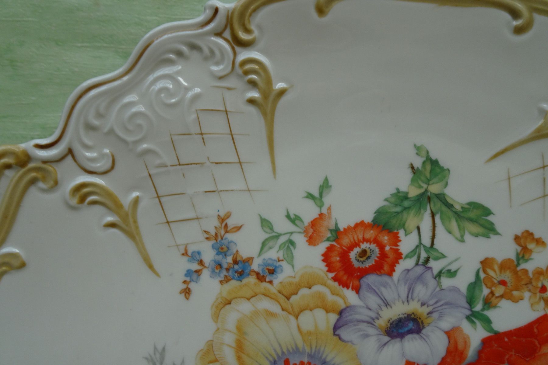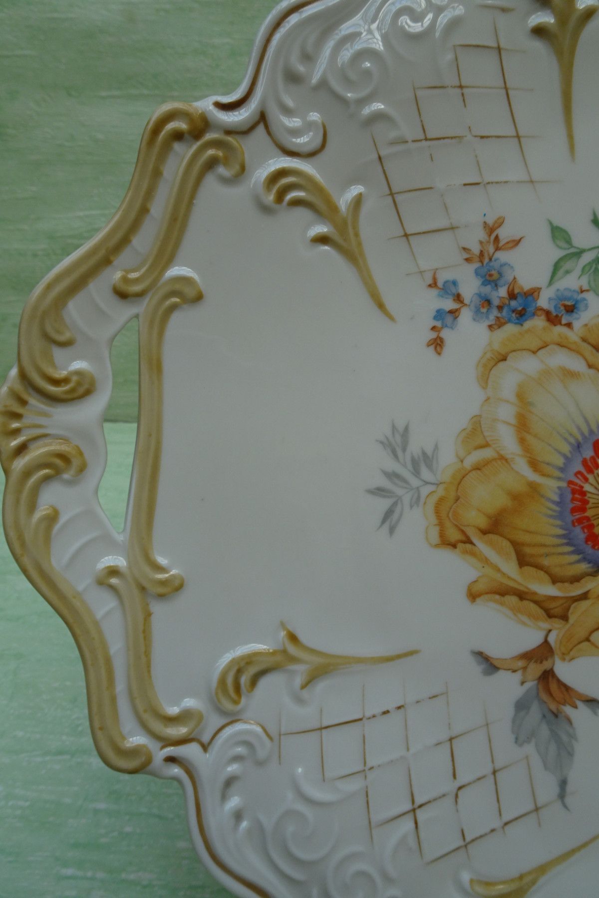 Reliefschale Teller Platte mit Griff Henkel Carstens Thüringen Blumendekor 34x29cm