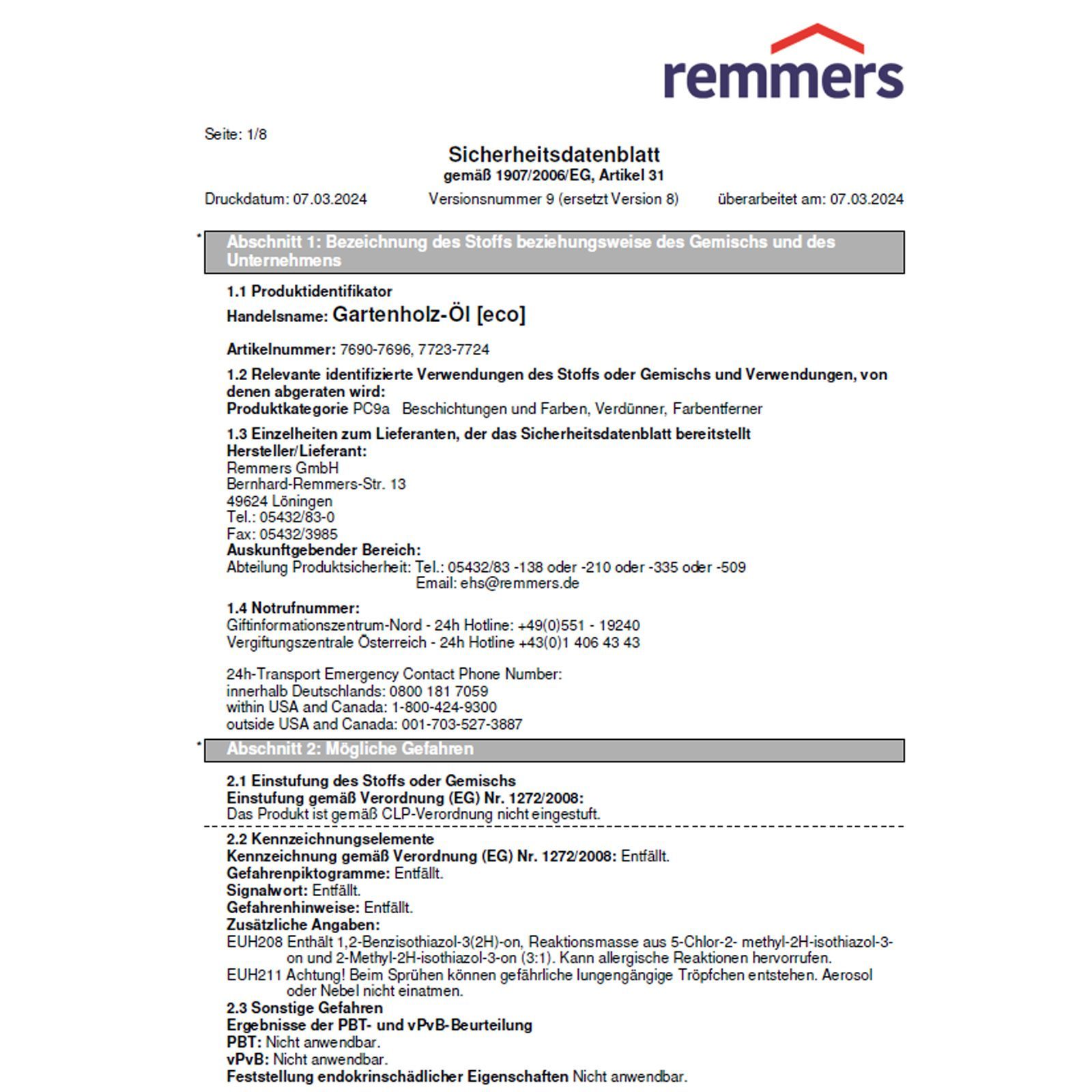 Remmers ECO Gartenholz-öl 0.75 LTR Holzöl Möbelöl Holzschutz Bodenöl Terrassenöl