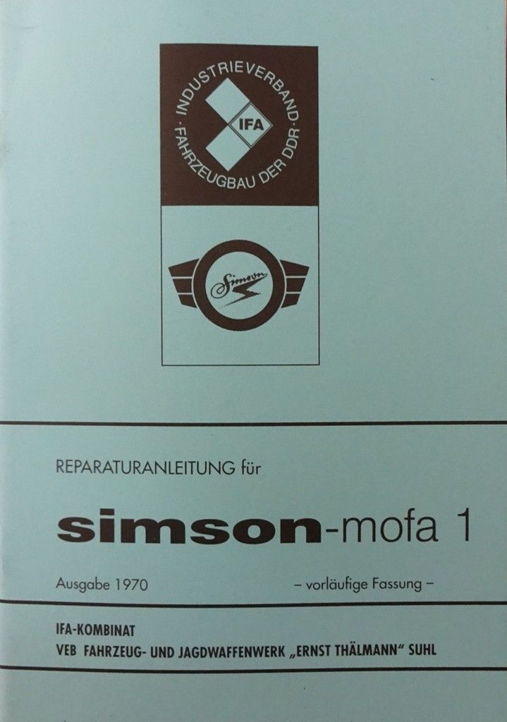 Reparaturanleitung Simson MOFA 1 Stand 1970 24 Seiten Format: A5 Technische Daten, Diagramme und Skizzen Allgemeine Bemerkungen Arbeiten am Motor Arbeiten am Antrieb Arbeiten am Hinterrad Spezialwerkzeug elektrischer Schaltplan ist enthalten Repro