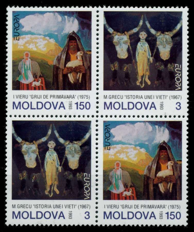 REPUBIK MOLDAU 1993 Nr 94-95 postfrisch VIERERBLOCK Europa Ausgabe 1993 - Zeitgenössische Kunst, 4er Block 2.60€ incl. MwSt: Differenzbesteuert zzgl. Versandkosten Bestell-Nr.: 691C16 Katalog-Nr: MICHEL (94 - 95) Katalogpreis: 8 EUR Qualität: Normal Erhaltung: Postfrisch ** Einheit: 4er Block B