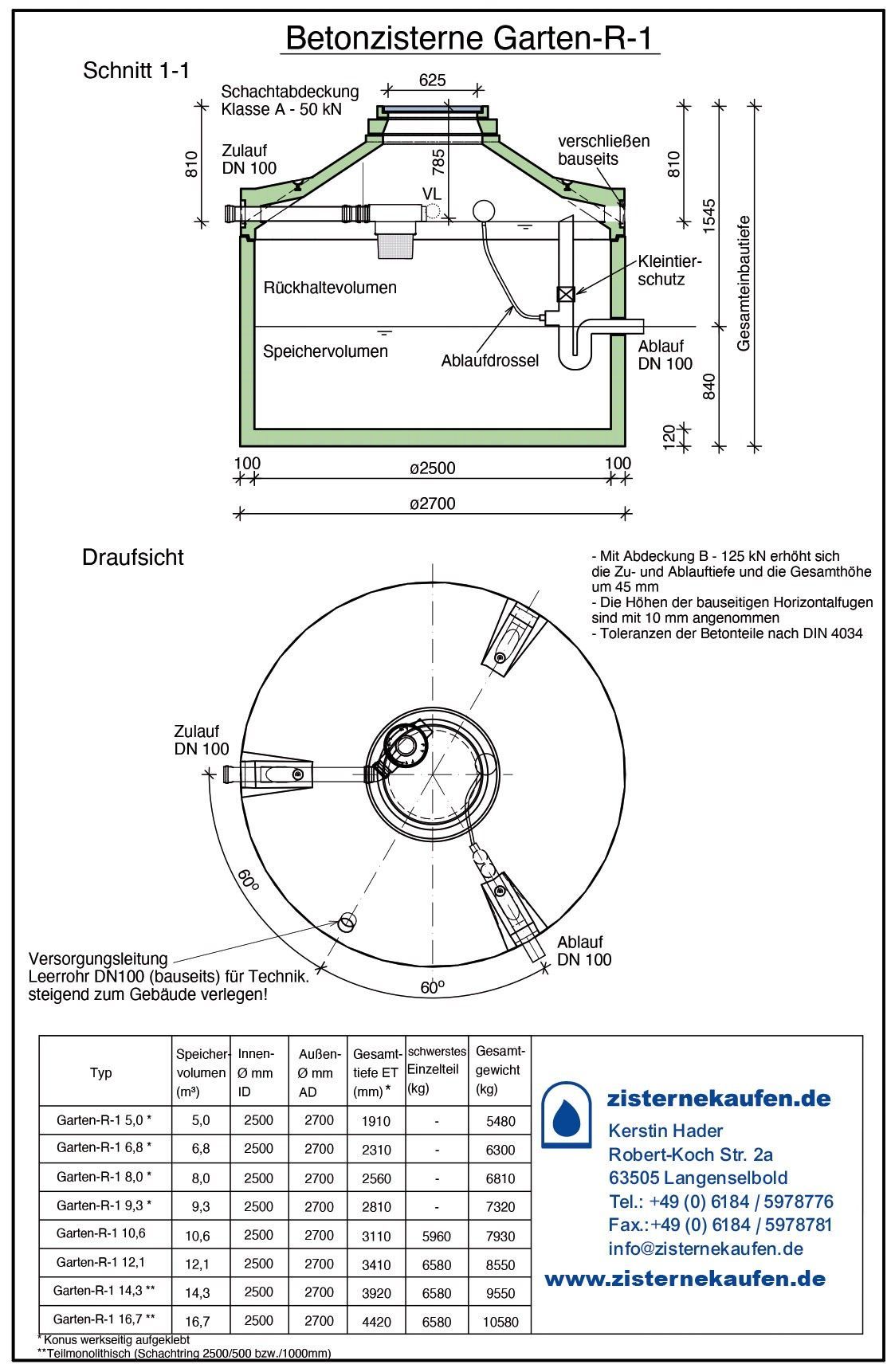 Betonzisterne Garten Retention Dachfläche bis 220 m² Unsere Betonzisternen haben eine Wand- Bodenstärke von 9-12 12 cm und sind aus Beton der Kl C35 45 d.h. wasserundurchlässig gefertigt. Die Zisterne ist monolithisch aufgebaut und der Konus ist bereits mit dem Grundbehälter verbunden, so dass