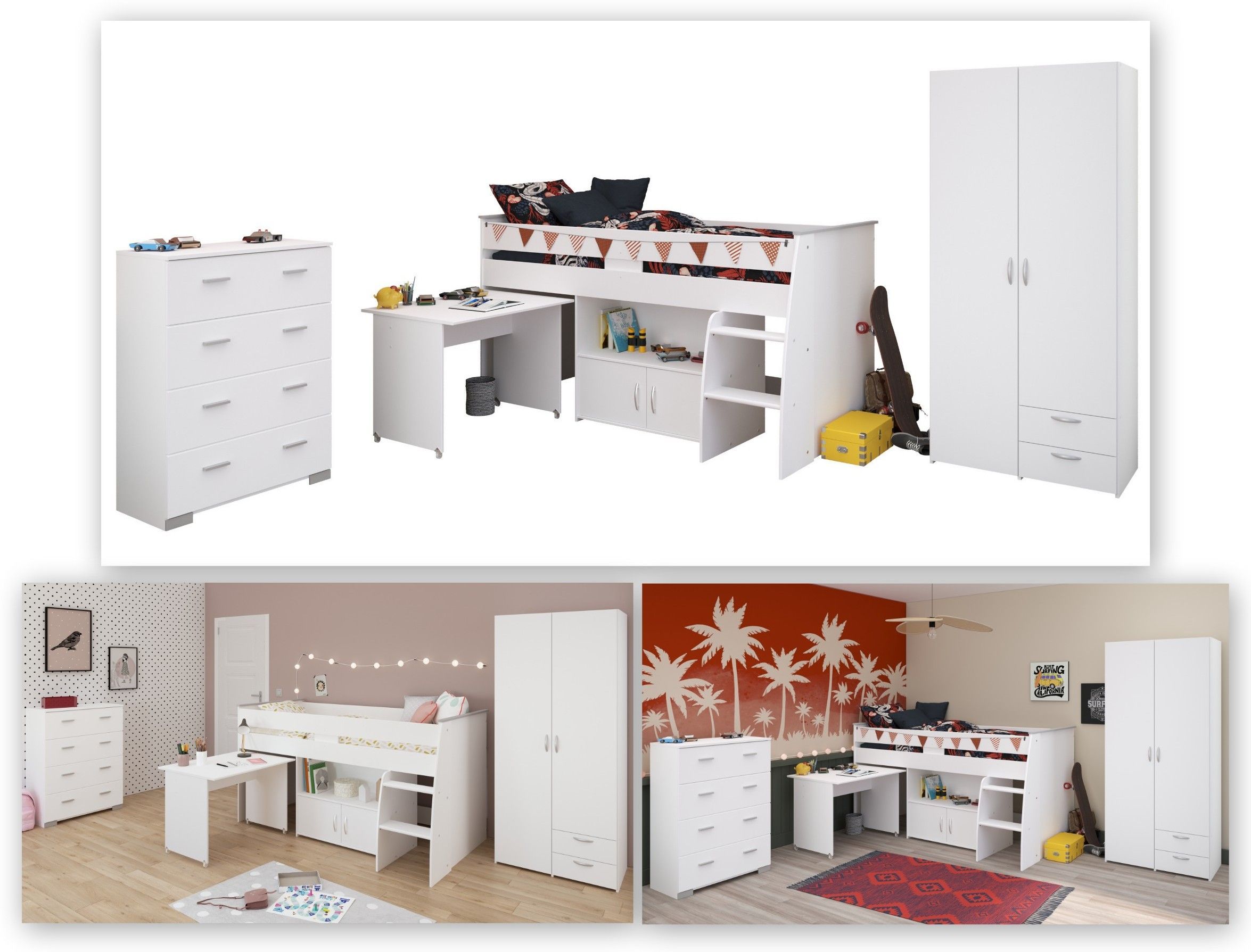 Reverse 11 Produktbeschreibung: Das Reverse 11 ist ein vielseitiges und modernes 3 - teiliges Kinderzimmer - Set in klassischem Weiß Dekor.Es bietet eine ideale Kombination aus Schlaf - und Arbeitsbereich und ist perfekt für stilvolle und gut organisierte Kinderzimmer geeignet. Merkmale: Modell: Rev