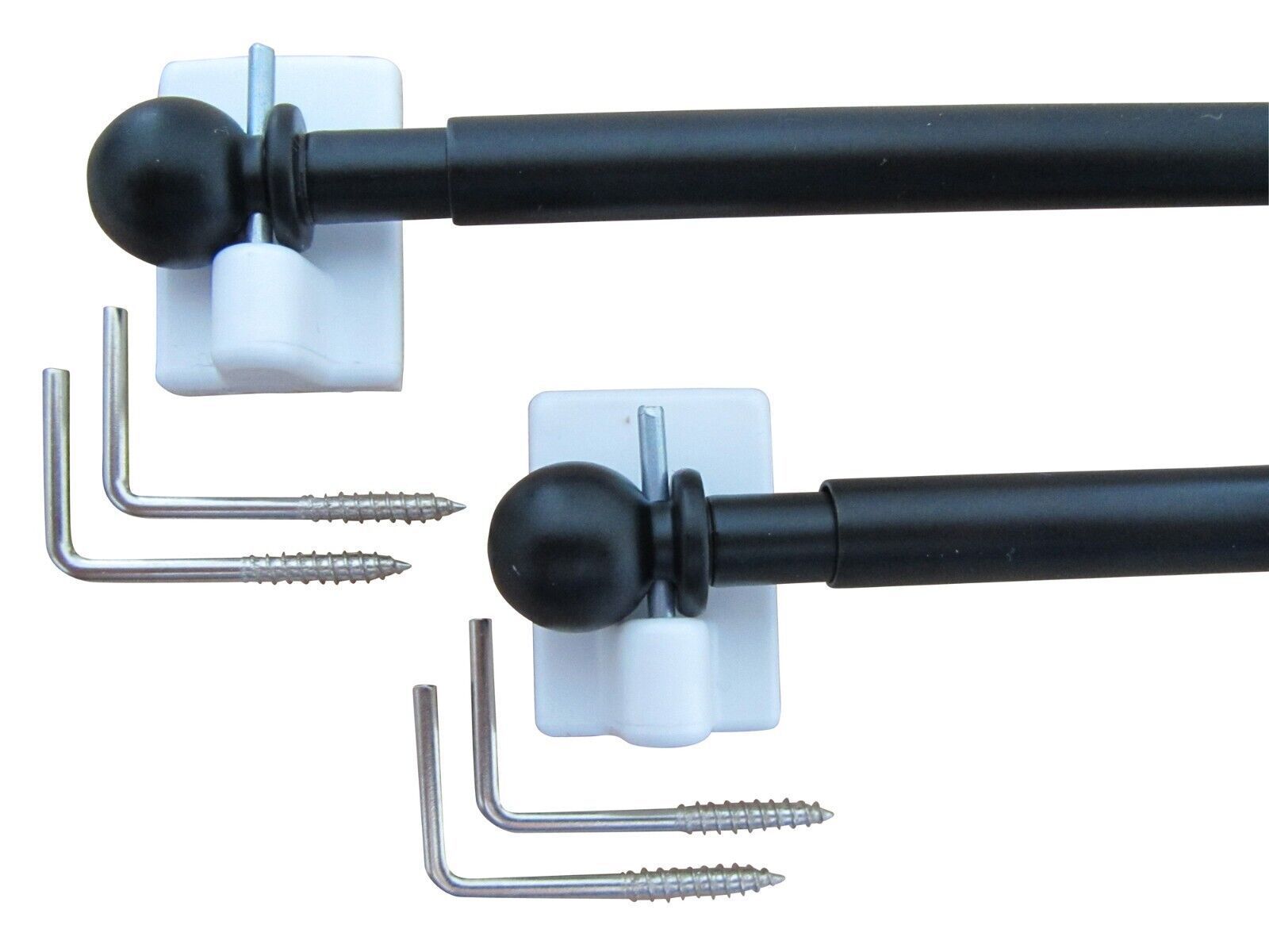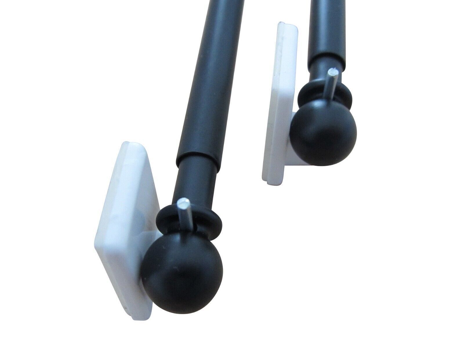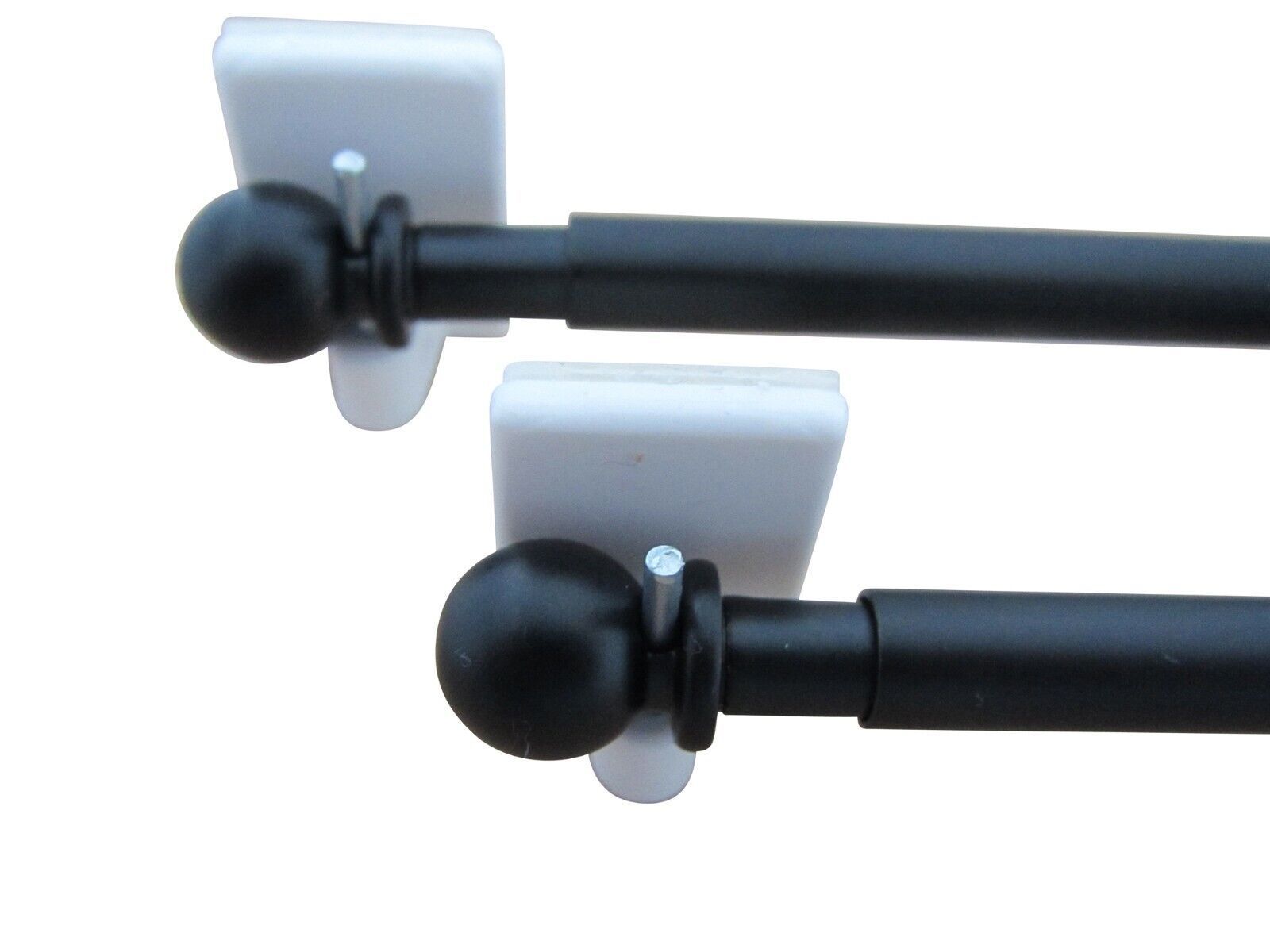 Vitragenstangen, Cafehausstangen, Gardinenstangen - Länge: 30-40 cm, 40-60 cm, 60-90cm, 90- 130 cm Durchmesser: Ø 8 mm Material: Messing Farbe: schwarz Verkaufseinheit: 2 Vitragenstangen mit 4 Vitragenklebehaken und 4 Vitragenstangen Haken