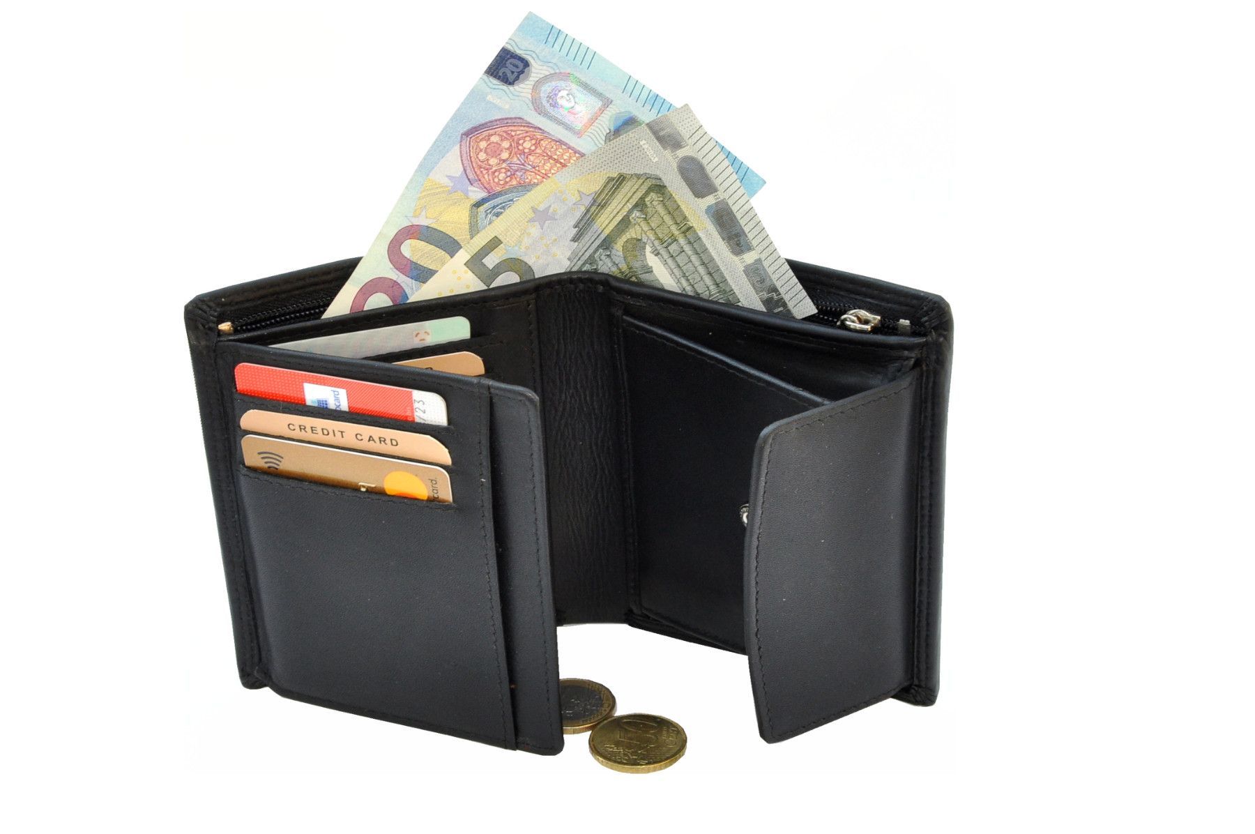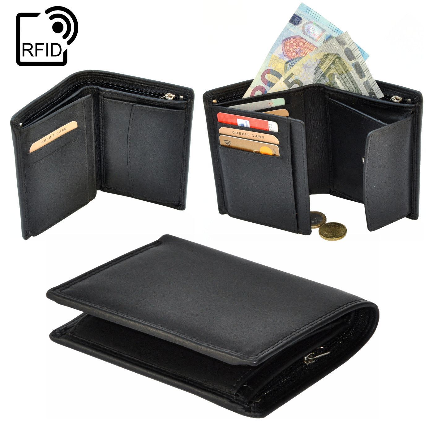 MENÜ Close Bild vergrößern RFID Portemonnaie Geldbörse Geldbeutel Herren Querformat Schwarz Leder Portemonnaie Leder schwarz: Praktische Herren Geldbörse im Querformat. Durchdacht mit geschickter Aufteilung für alle gängigen Karten und Zahlungsmittel Die hohe Benutzerfreundlichkeit macht diese Geldb