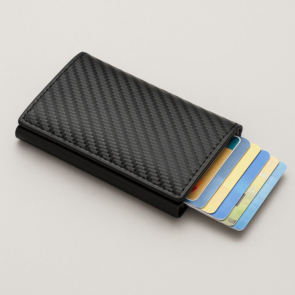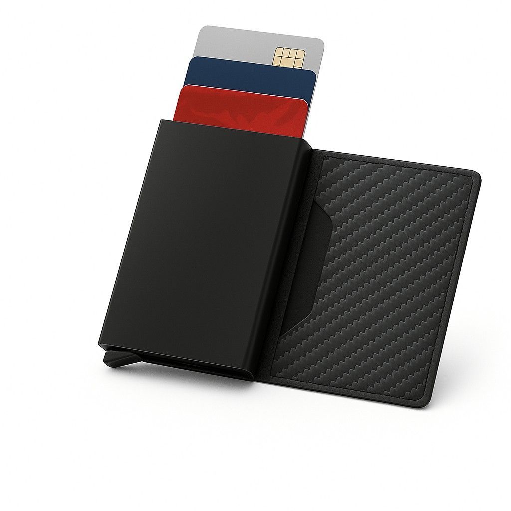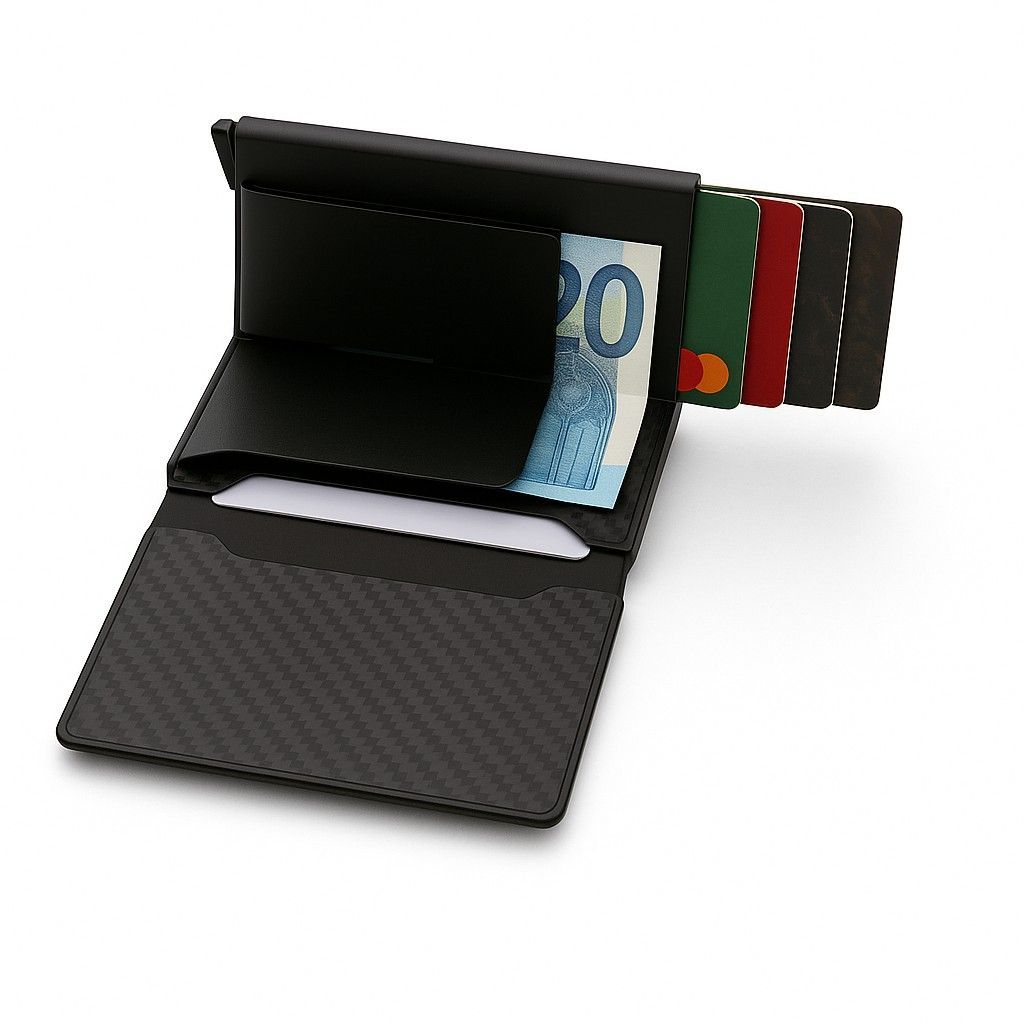 Ihre Vorteile im ÜberblickI - Praktische Auswurffunktion – Karten gleiten per Knopfdruck mühelos heraus - Platz für bis zu 12 Karten – alles Wichtige kompakt verstaut - Aufklappbarer Bereich – zusätzlicher Stauraum für Scheine & Ausweise - RFID-Schutz – schützt zuverlässig vor kontaktlosem Datendiebstahl - Robust & elegant – erhältlich in Schwarz, Carbon-Optik oder Braun - Slim Wallet Design – schlank, leicht & passt in jede Tasche - Vielseitig – perfekt für Business, Freizeit & Reisen