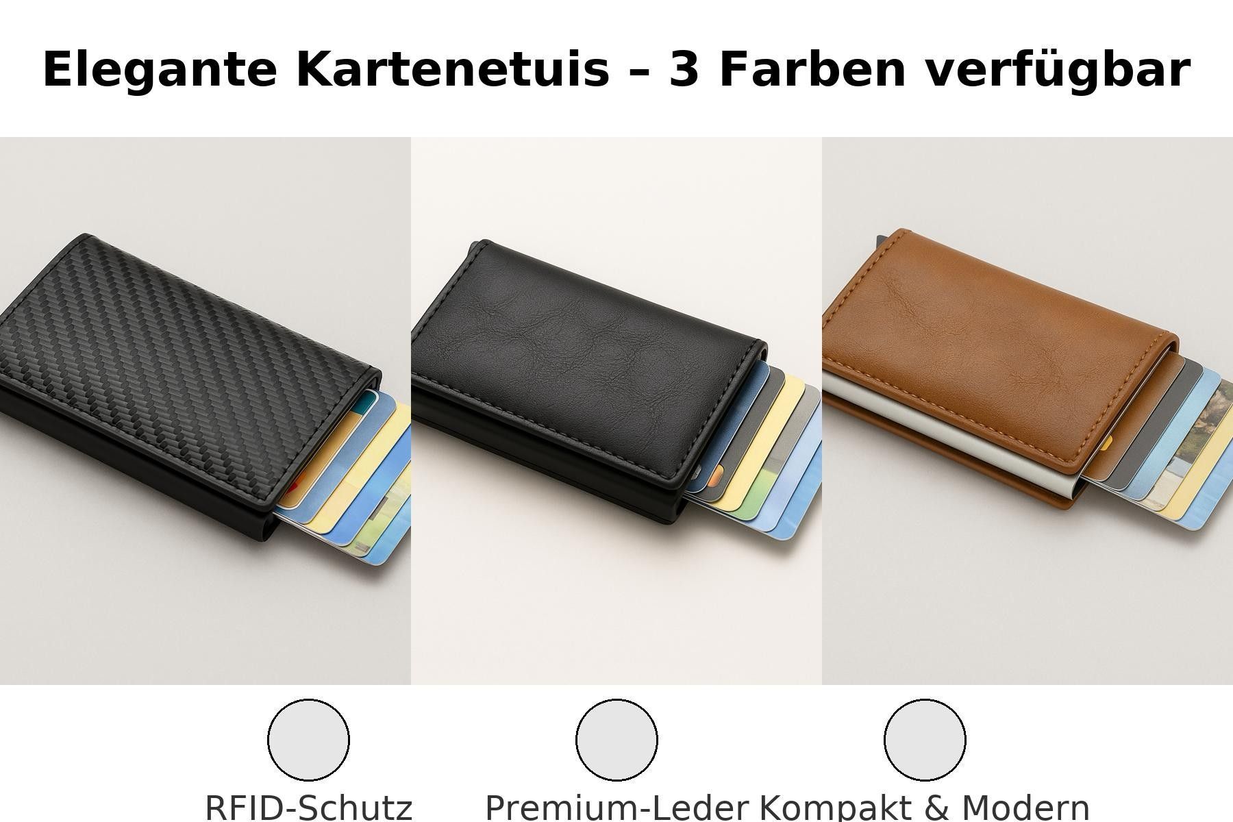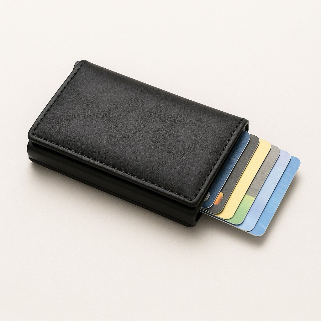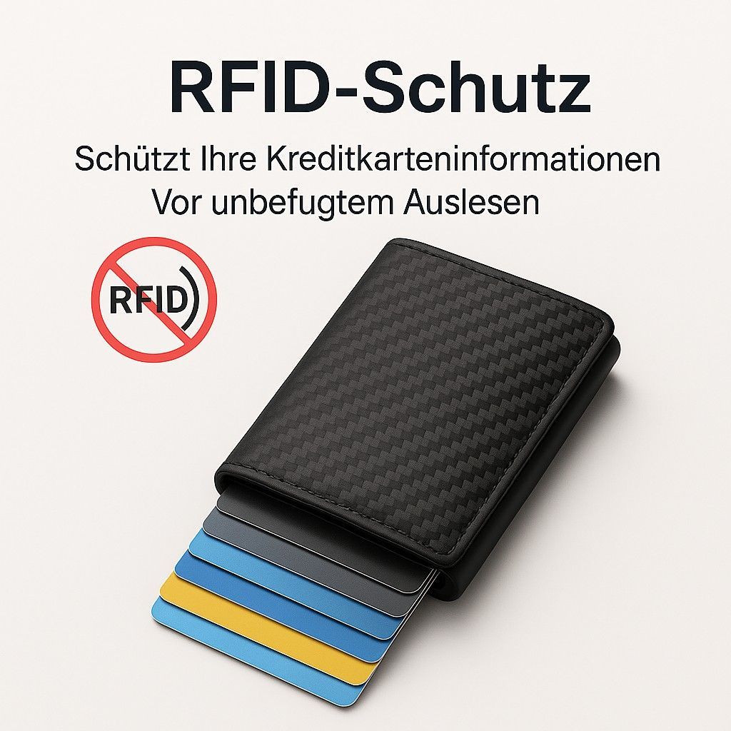 Ihre Vorteile im ÜberblickI - Praktische Auswurffunktion – Karten gleiten per Knopfdruck mühelos heraus - Platz für bis zu 12 Karten – alles Wichtige kompakt verstaut - Aufklappbarer Bereich – zusätzlicher Stauraum für Scheine & Ausweise - RFID-Schutz – schützt zuverlässig vor kontaktlosem Datendiebstahl - Robust & elegant – erhältlich in Schwarz, Carbon-Optik oder Braun - Slim Wallet Design – schlank, leicht & passt in jede Tasche - Vielseitig – perfekt für Business, Freizeit & Reisen