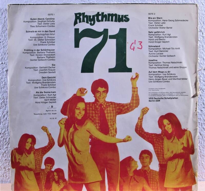 Rhythmus 71 Amiga 8 55 242 1971 Vinyl: VG+ Cover: G (Beschädigung Cover Rücken) u.a. mit Theo Schumann Combo, Horst Krüger Septett, Dresden Sextett, Gerti Möller, Frank Schöbel, Thomas Natschinski Hersteller EU Verantwortliche Person Lieferzeit 3 - 6 Tage